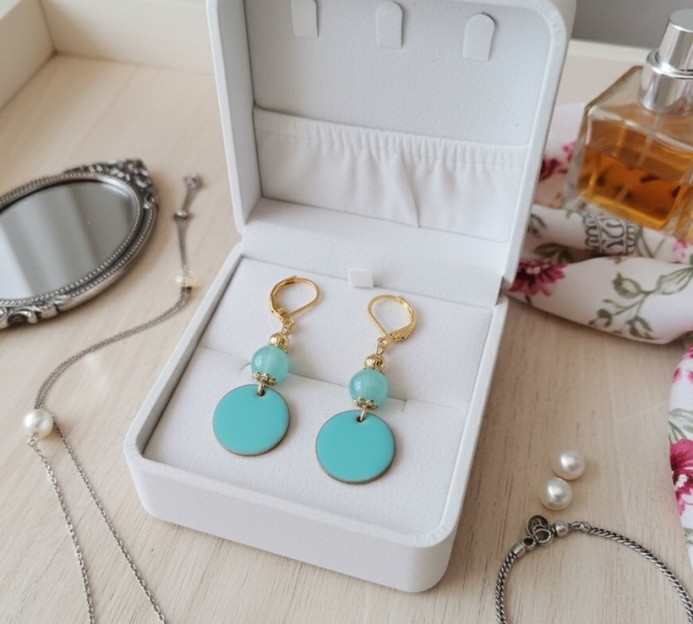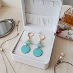 Boucles d'oreilles en acier inoxydable (dormeuses à levier, tige et anneaux) de couleur doré avec perles en verre de 8 mm de couleur bleue et sequin émail de 16 mm