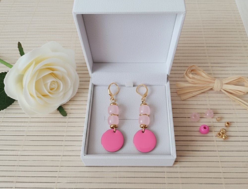 Elles sont composées de perles en verre colonne de 8 mm et d'un sequin émail de 15 mm