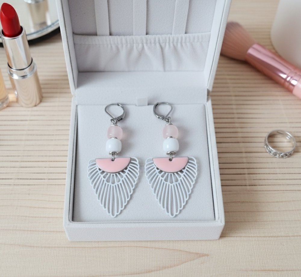 Boucles d'oreilles en acier inoxydable (dormeuse à levier, tige et anneaux) avec perles en verre colonne 8 mm , pendentif aile et sequin demi lune émail