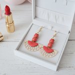 Boucles d'oreilles en acier inoxydable (pendentif, dormeuse à levier, tige et anneaux) avec perles en verre colonne 8 mm corail, pendentif éventail acier inoxydable et sequin demi lune émail corail