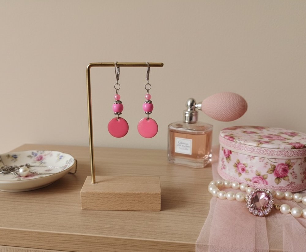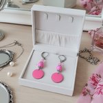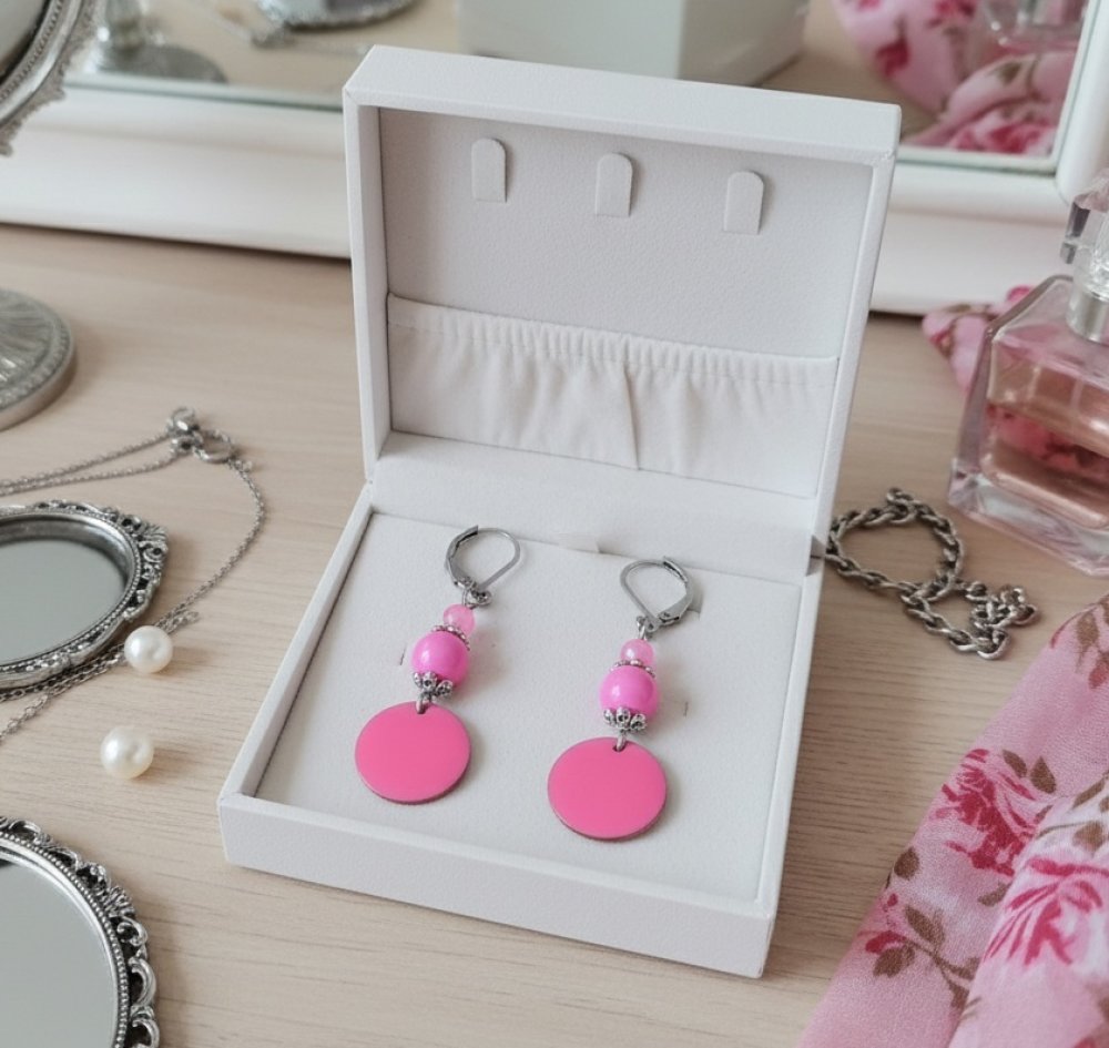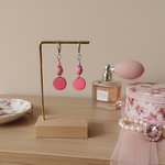 Boucles d'oreilles en acier inoxydable (dormeuses à levier, tige et anneaux) de couleur argent mat avec perles en verre de 8 mm de couleur rose vif et sequin émail de 16 mm