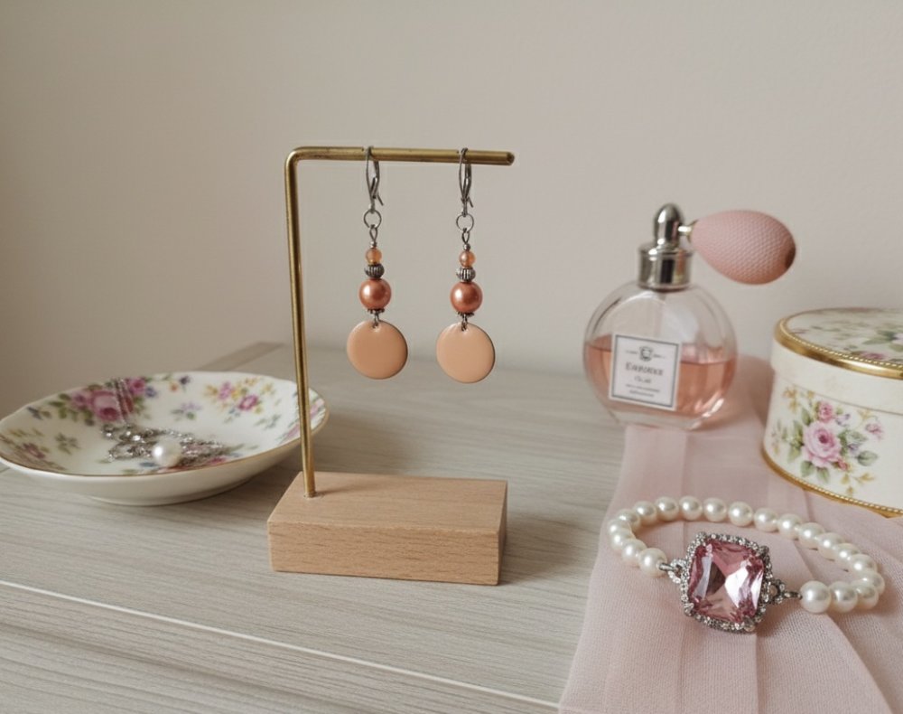Boucles d'oreilles en acier inoxydable (dormeuses à levier, tige et anneaux) de couleur argent mat avec perles en verre de 8 mm de couleur chair et sequin émail de 16 mm