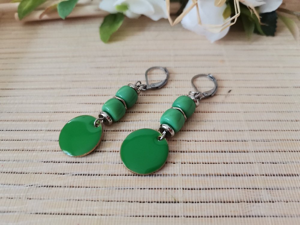 Elles sont composées de perles en verre colonne de 8 mm et d'un sequin émail de 15 mm