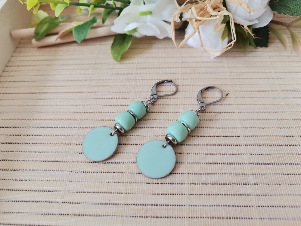 Elles sont composées de perles en verre colonne de 8 mm et d'un sequin émail de 15 mm