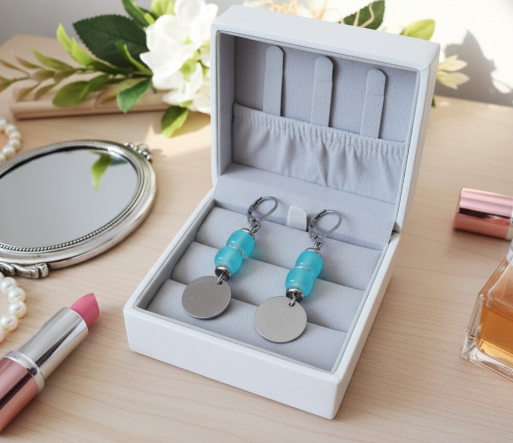 Les dormeuses, perles rondelles intercalaires, anneaux et clous sont en acier inoxydable et donc anti allergie.