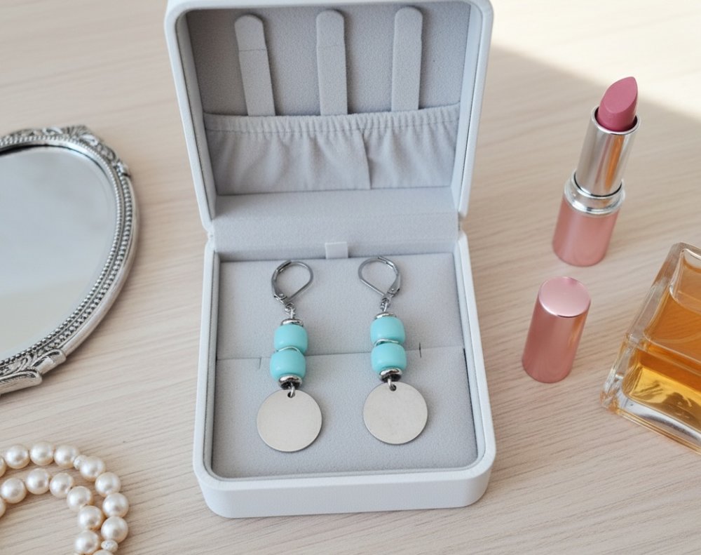 Les dormeuses, perles rondelles intercalaires, anneaux et clous sont en acier inoxydable et donc anti allergie.