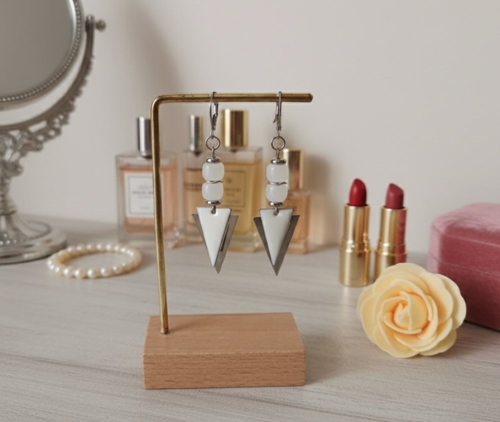 Boucles d'oreilles montées sur dormeuses à levier, avec perles en verre colonne et pendentifs triangle métal et émail