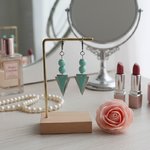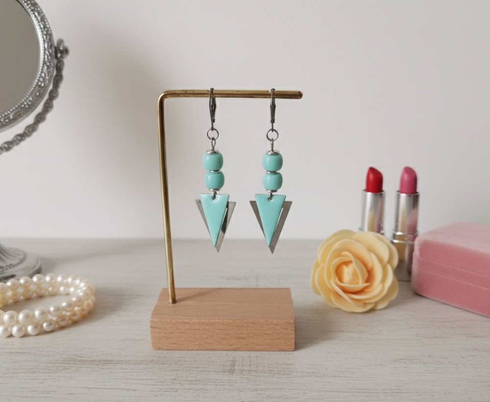 Boucles d'oreilles montées sur dormeuses à levier, avec perles en verre colonne et pendentifs triangle métal et émail