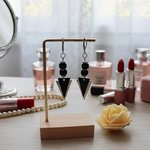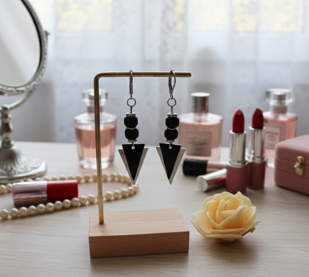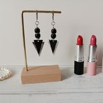 Boucles d'oreilles montées sur dormeuses à levier, avec perles en verre colonne et pendentifs triangle métal et émail