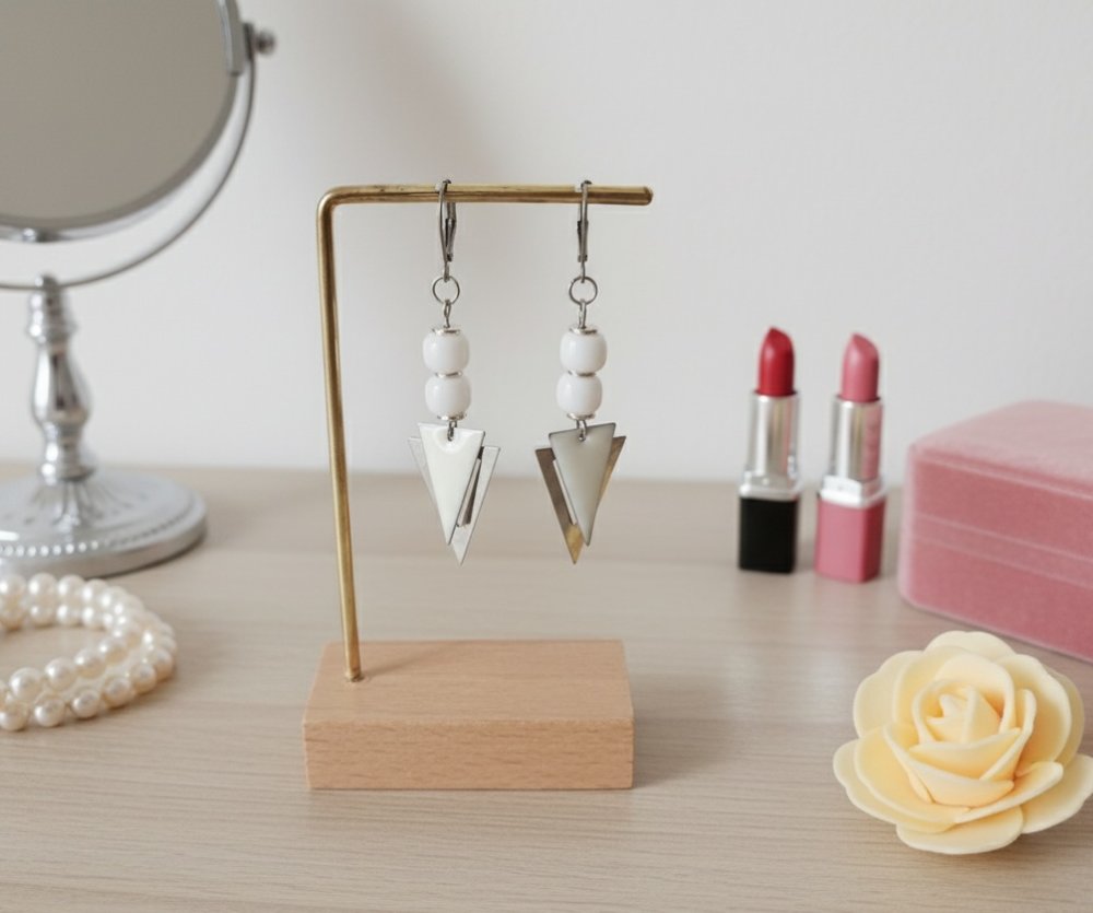 Boucles d'oreilles montées sur dormeuses à levier, avec perles en verre colonne et pendentifs triangle métal et émail