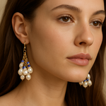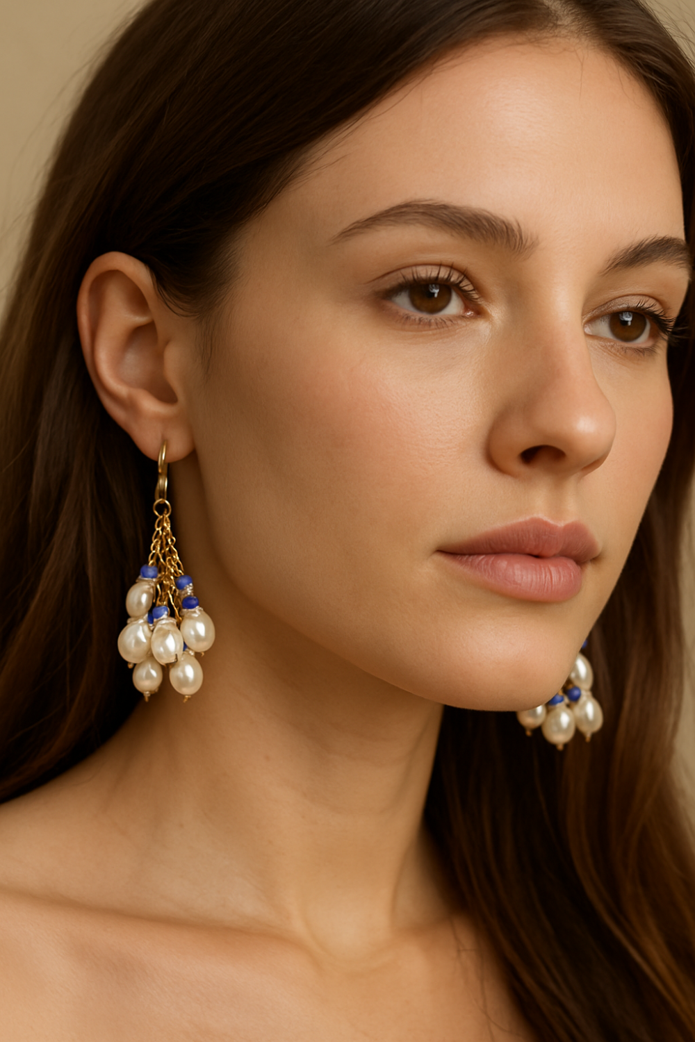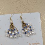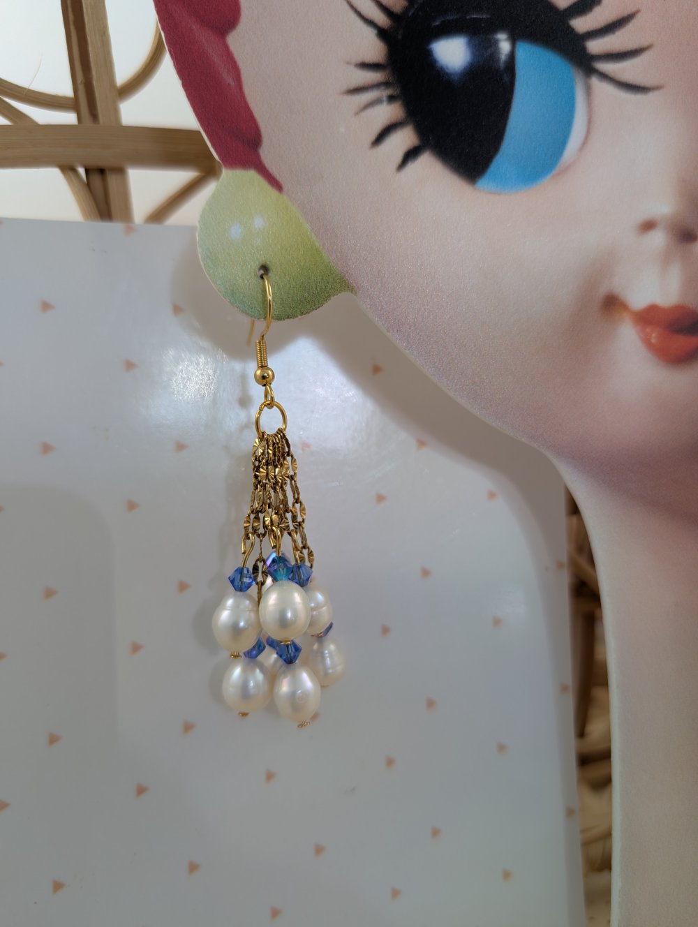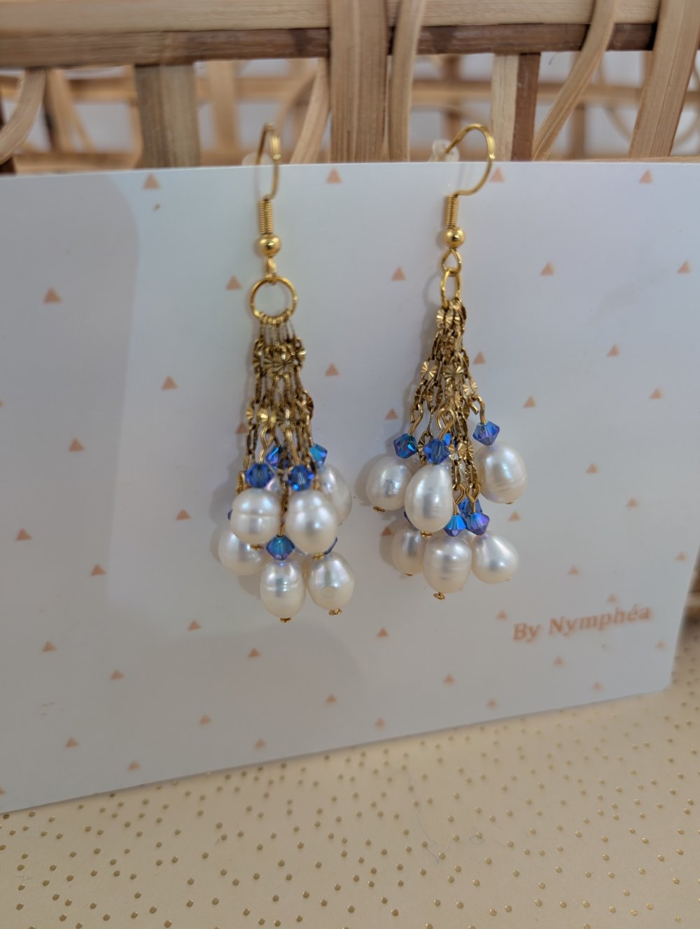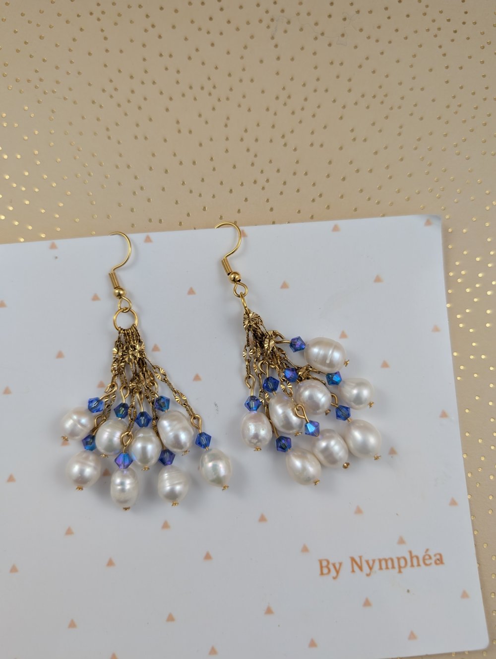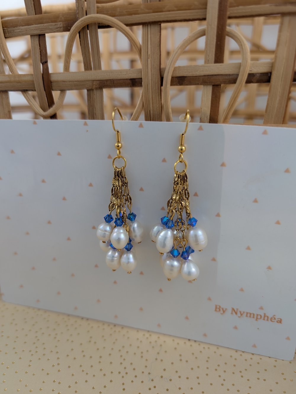 ✨ Ces boucles d’oreilles pendantes raffinées sont composées de véritables perles d’eau douce blanches associées à des cristaux bleus étincelants.