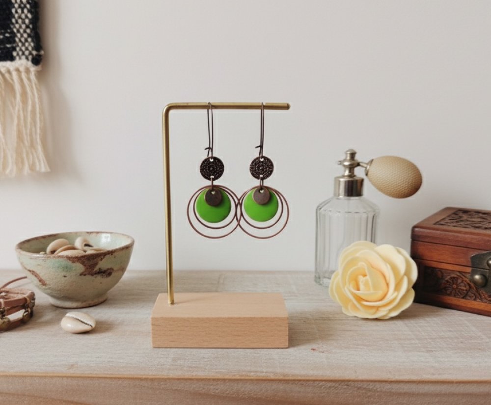 Boucles d'oreilles anneaux cuivre rouge et sequin émail rond