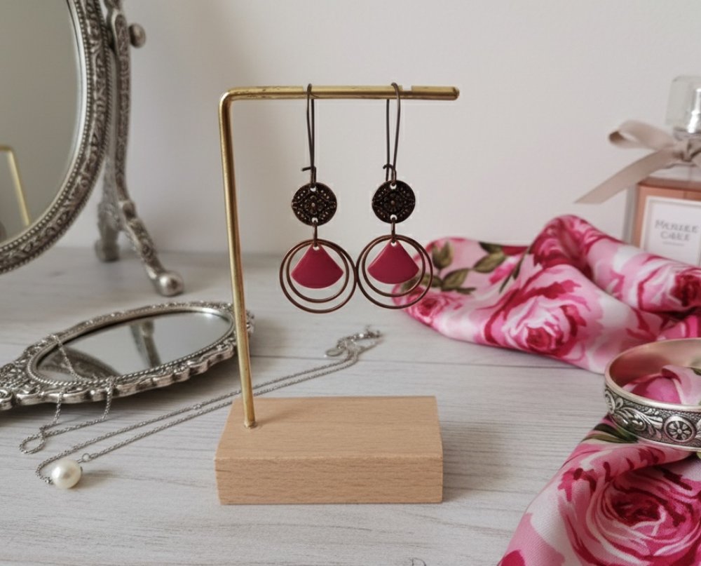 Boucles d'oreilles anneaux cuivre rouge et sequin émail
