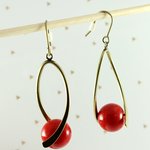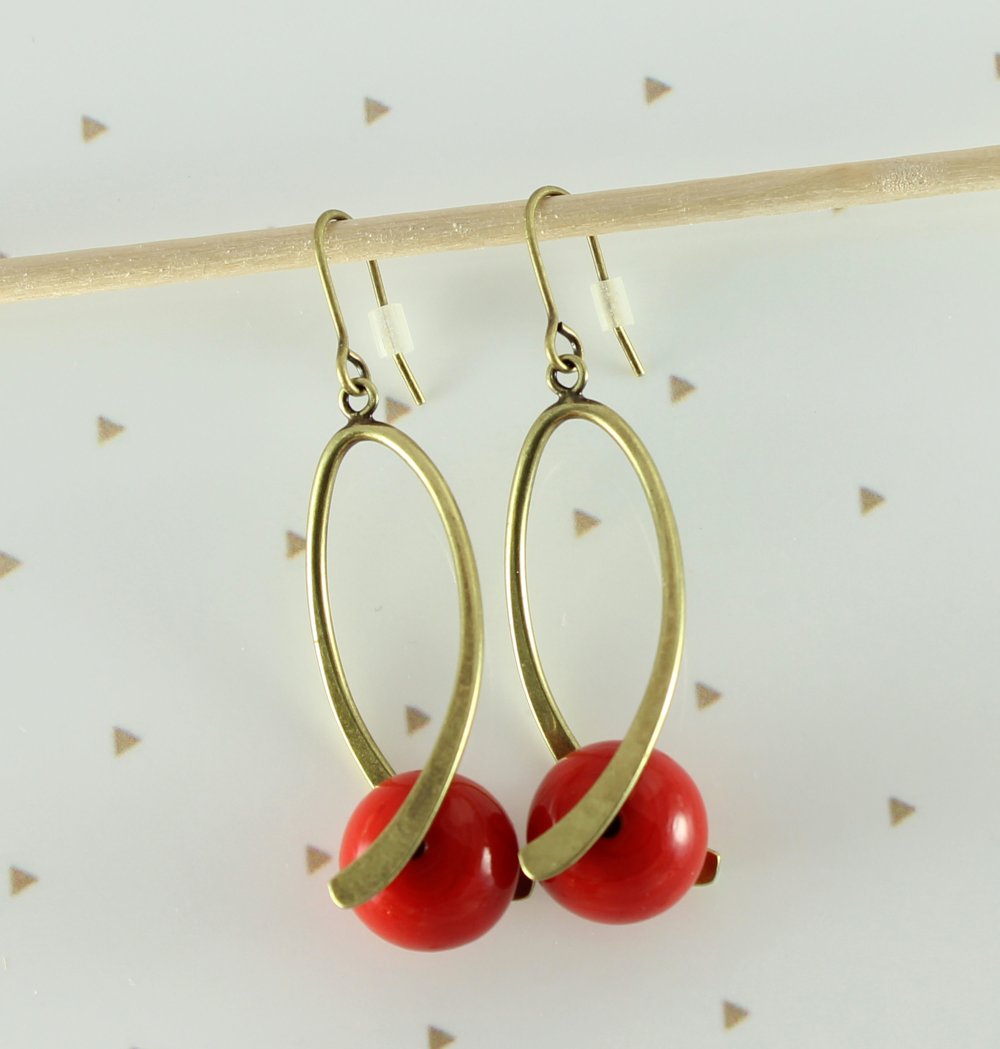 Boucles d'oreilles pendantes laiton perles rouges en verre, boucles d'oreilles tordues, anneau tordu vague