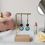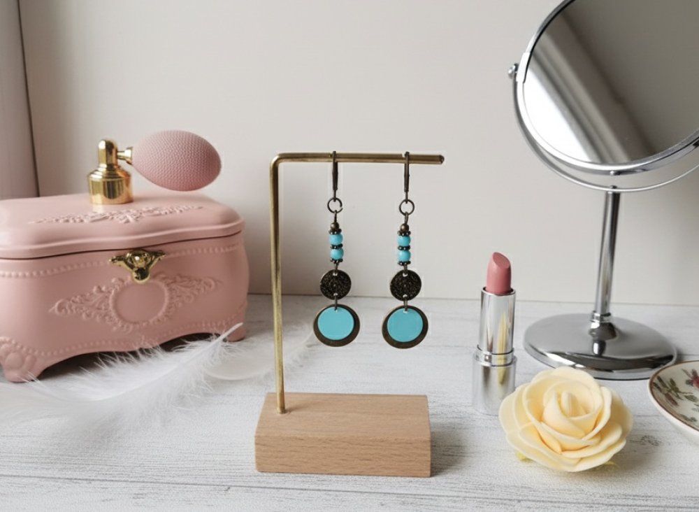 Boucles d'oreilles pendantes avec dormeuses à levier, petites perles en verre de 4 mm, connecteur métal rond bronze, pendentif métal rond bronze et sequin bleu