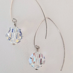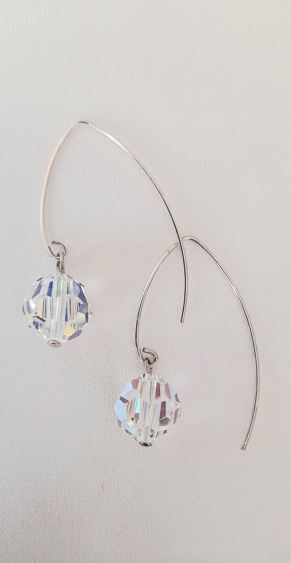 La boucle de forme fil est en argent recyclé, d'une longueur de 30 mm à l'arrière, avec un cristal facetté de la marque Swarovski, transparent qui accroche les lumières.
