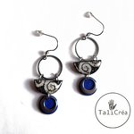 Une paire de boucles d'oreilles anneaux d'acier argentés, demi rond de sables noirs, blancs; avec sequin d'émail bleu marine et breloque en acier argenté.