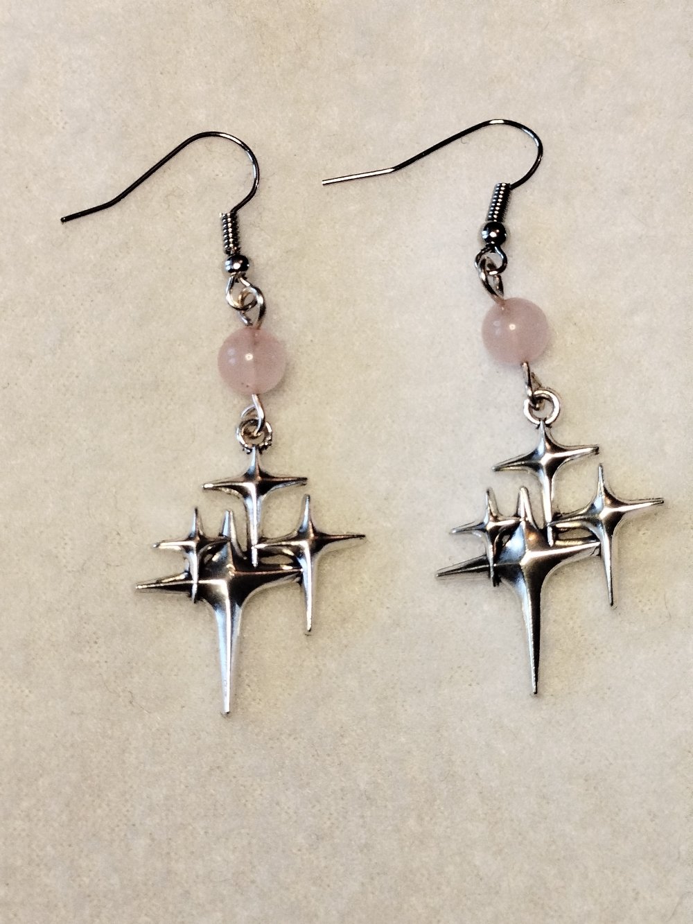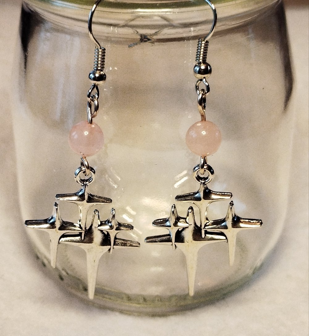 Jolies boucles d'oreilles argentées, faites main, perle en quartz rose et pendentif Graphique