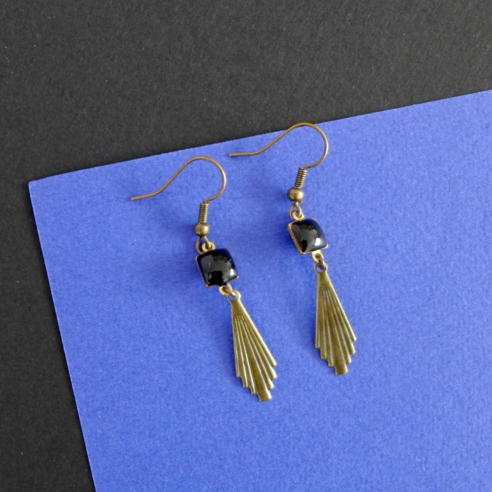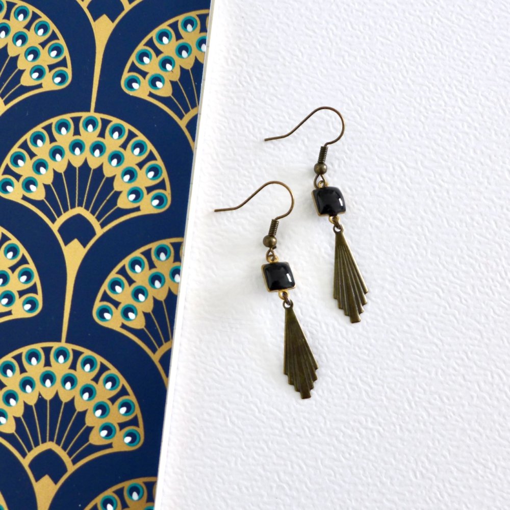 Boucles d'oreilles Art Déco fine estampe éventail et émail noir