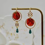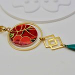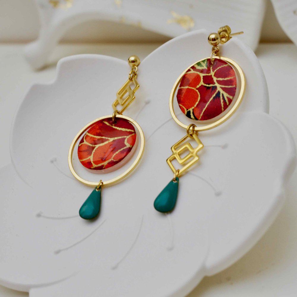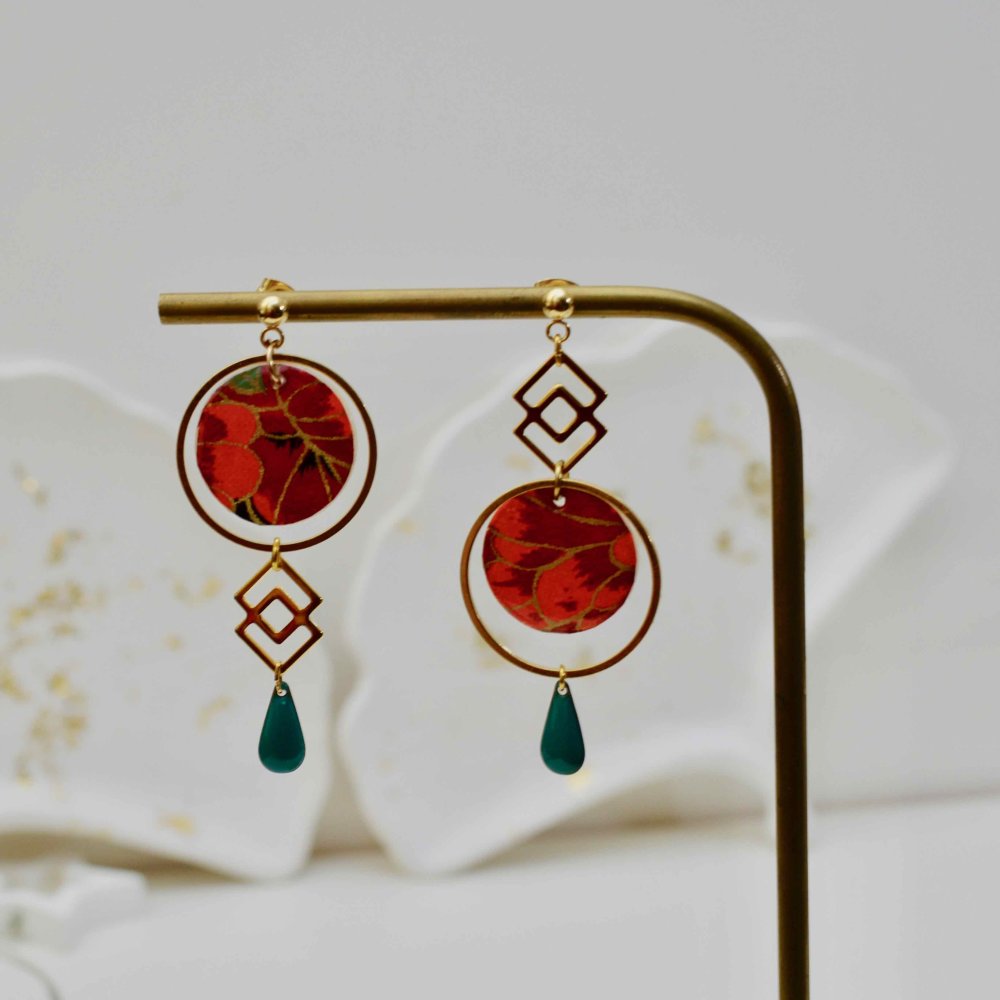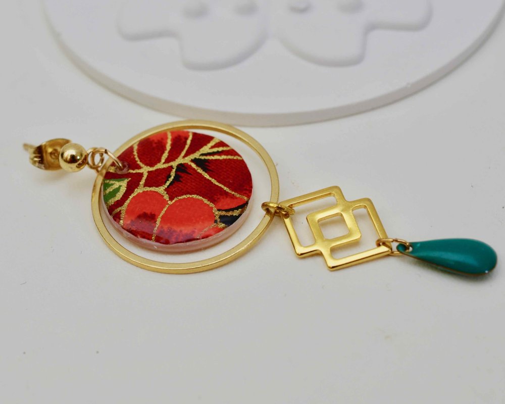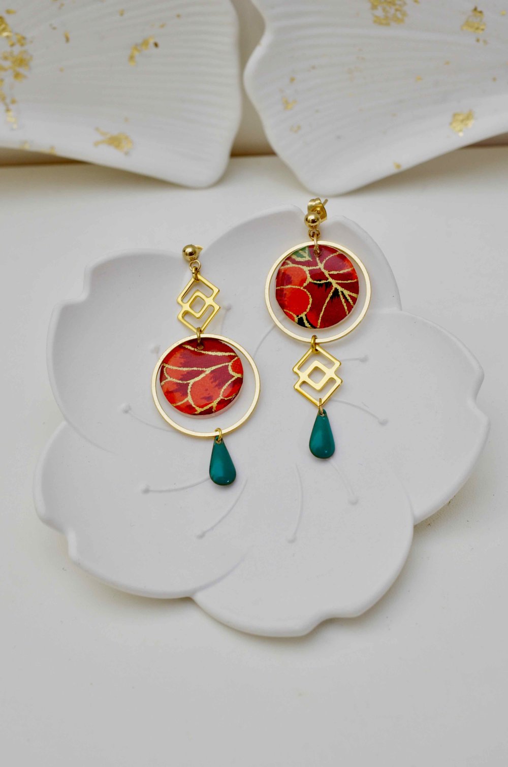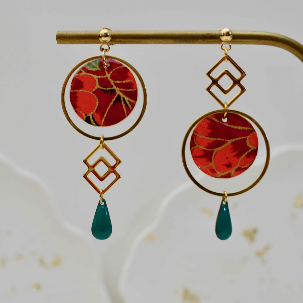 Boucles d'oreilles asymétriques avec du papier japonais rouge intense et des sequins émaillés verts avec des petits losanges ajourés