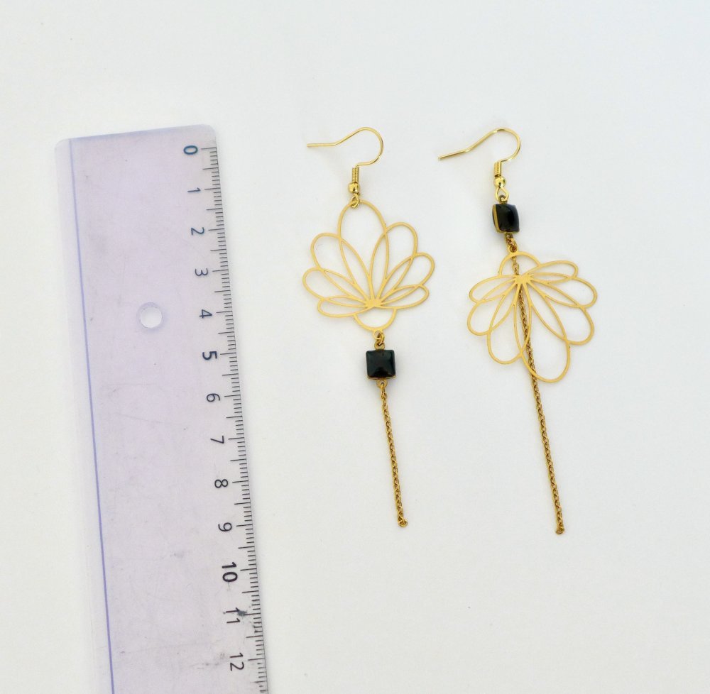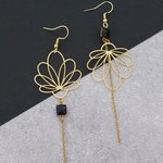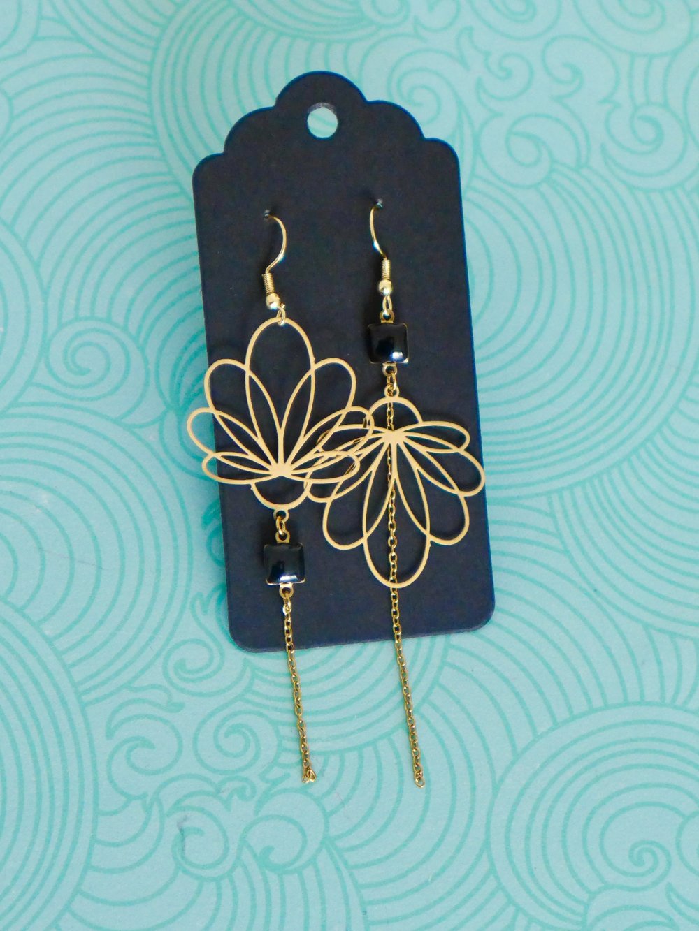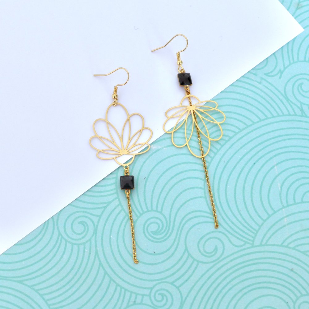 Boucles d'oreilles asymétriques graphiques fleur doré et émail noir