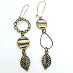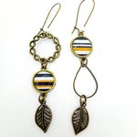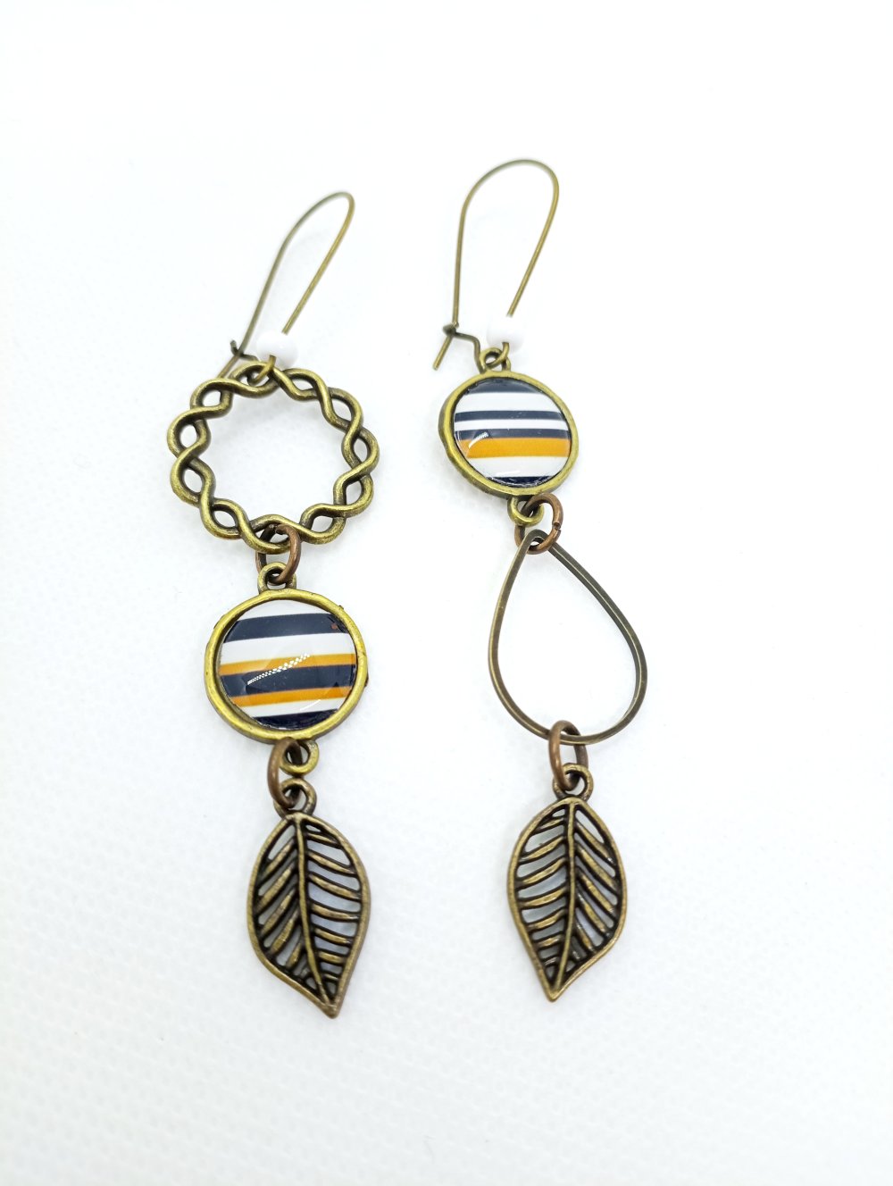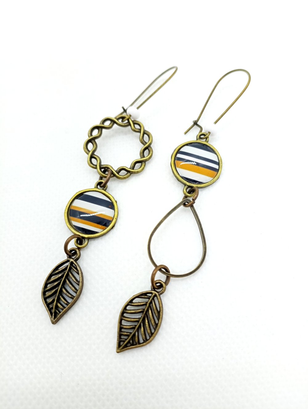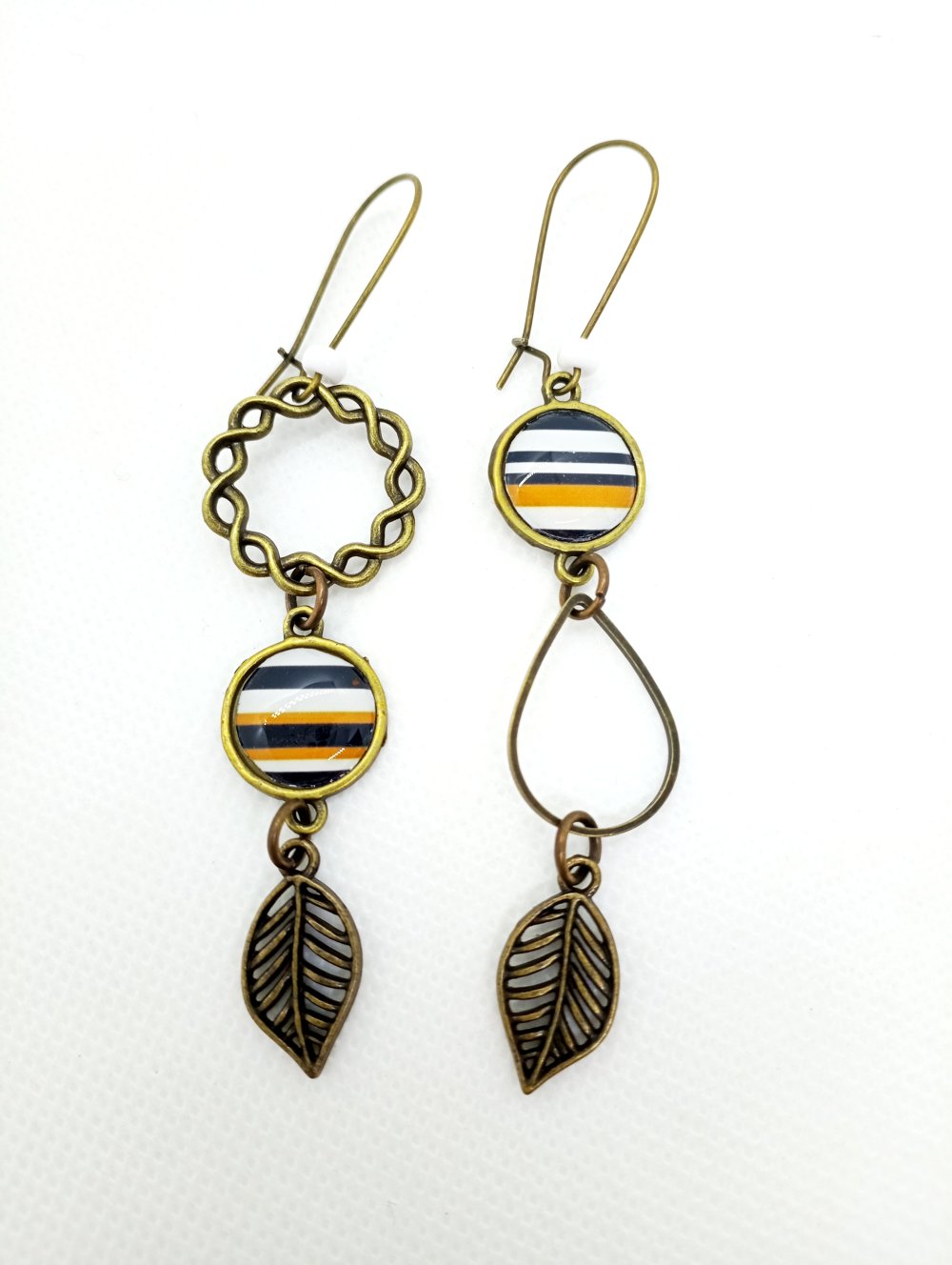 Paire de boucles d'oreilles asymétriques en laiton doré avec pendentifs recouverts de cabochons en résine motifs noirs et dorés.
