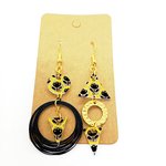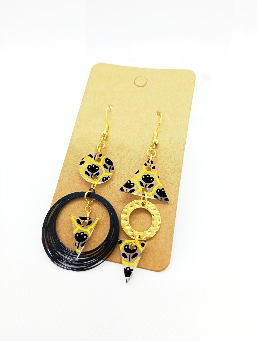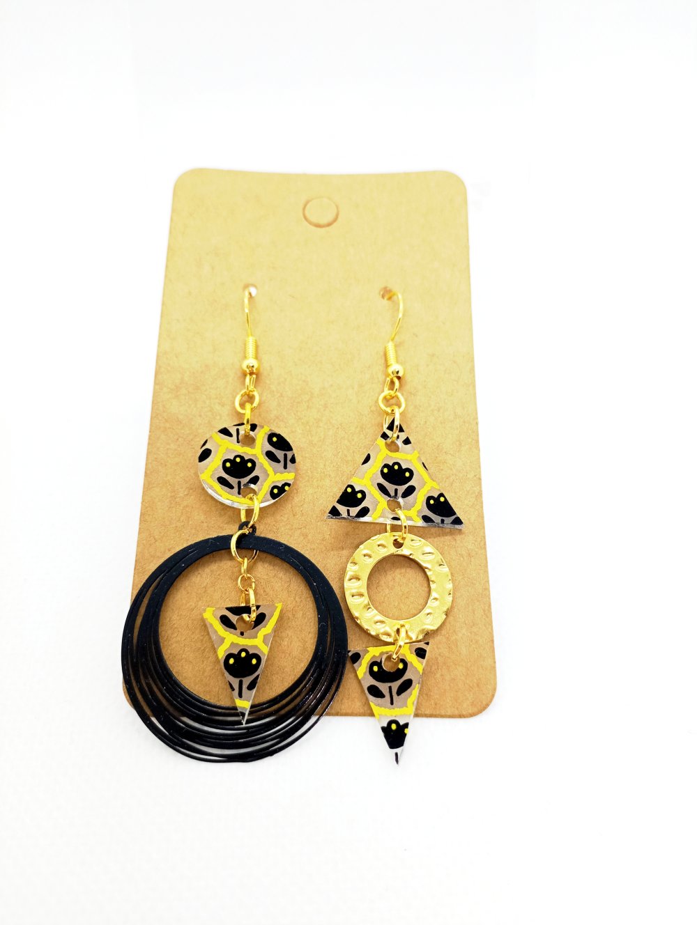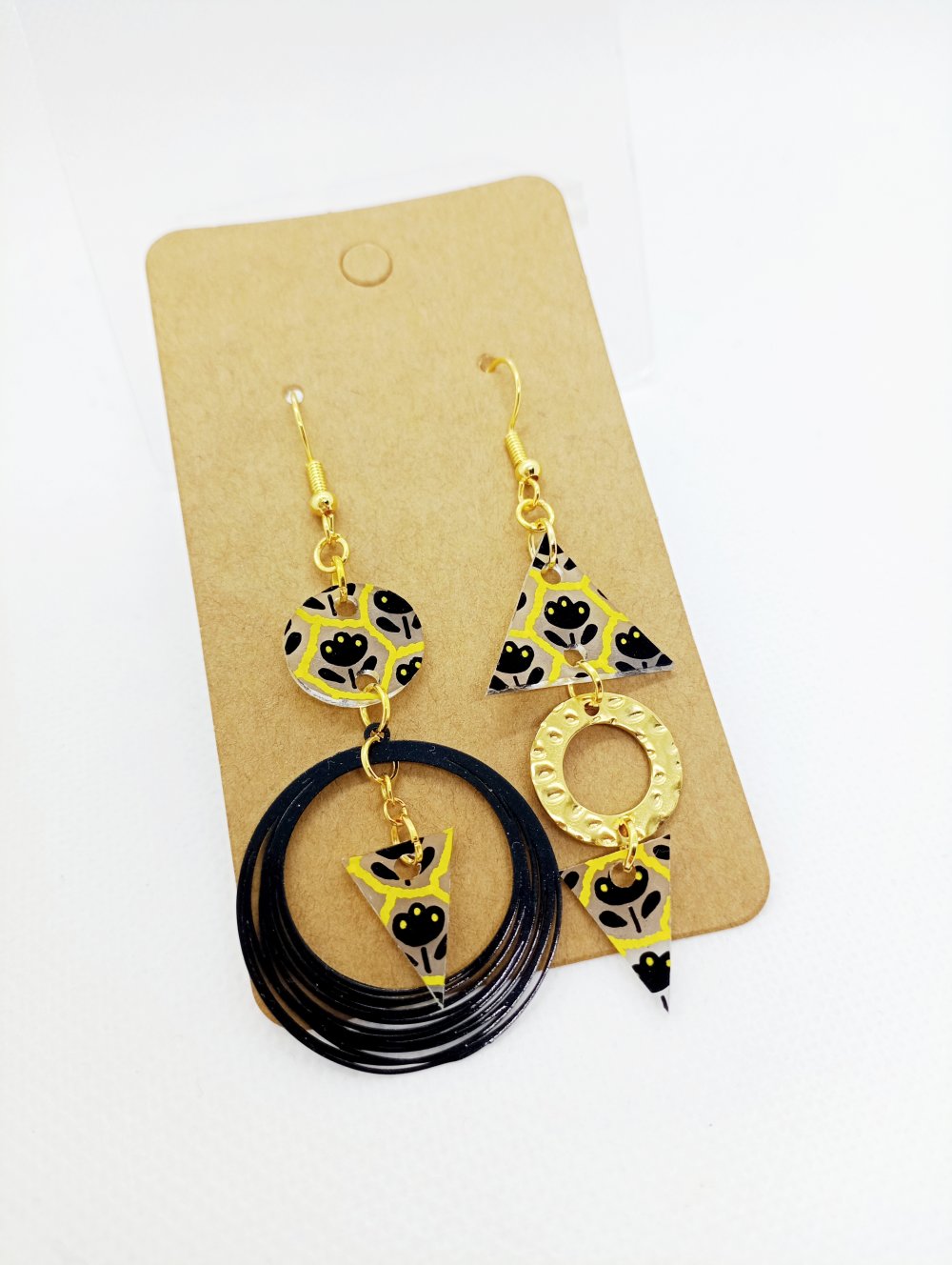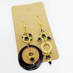 Boucles d'oreilles asymétriques en acier inoxydable doré avec pendentifs en acrylique *fait main* motifs floraux noirs et jaunes.