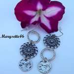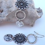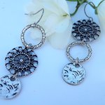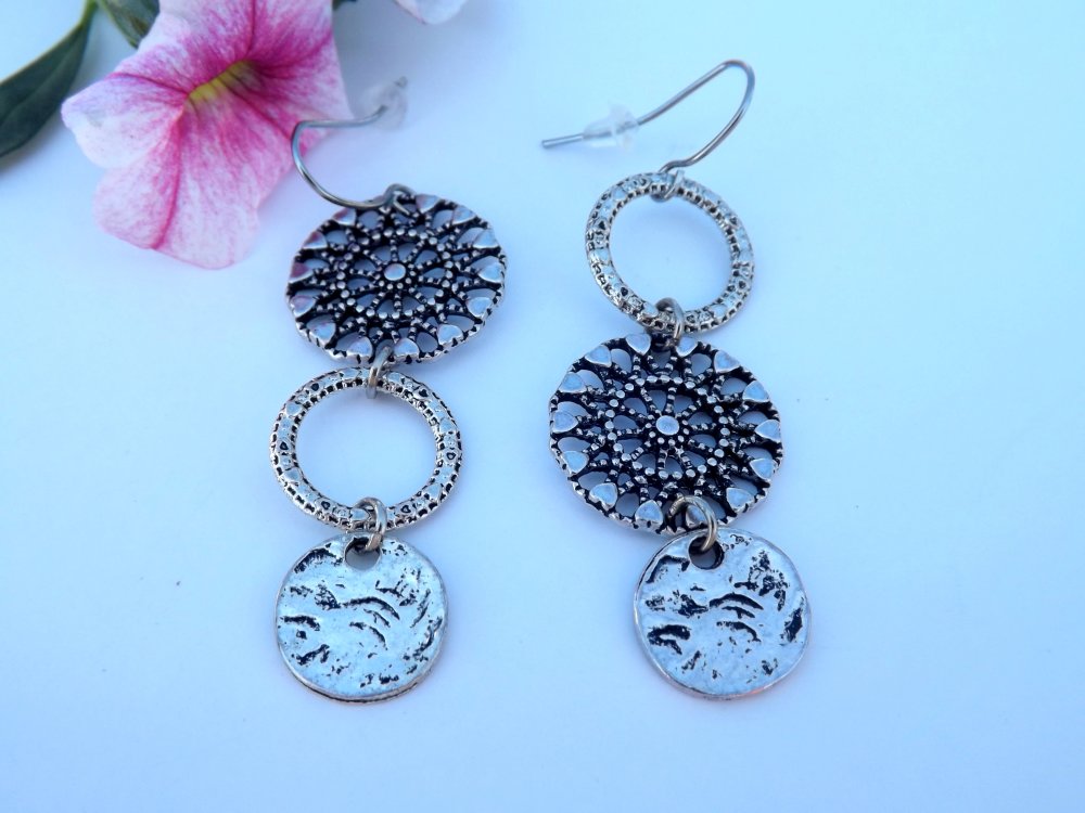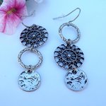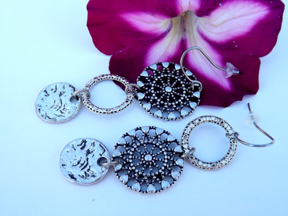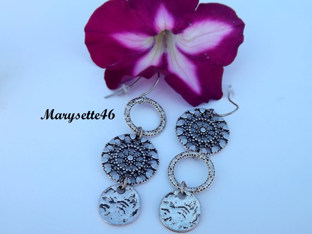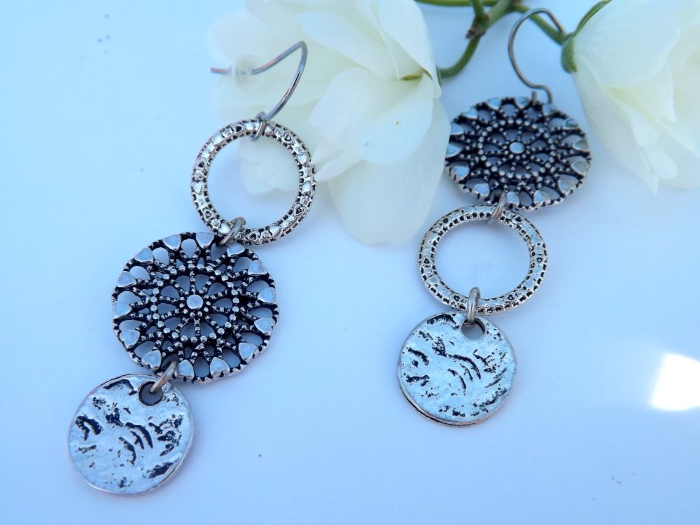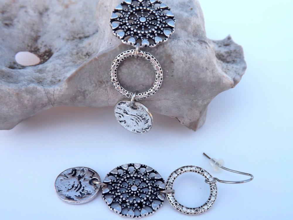 Boucles d'oreilles asymétriques en métal argenté à anneau rond de 14,5 mm, une estampe filigranée de 18 mm ainsi qu'un sequin martelé de 8 mm.