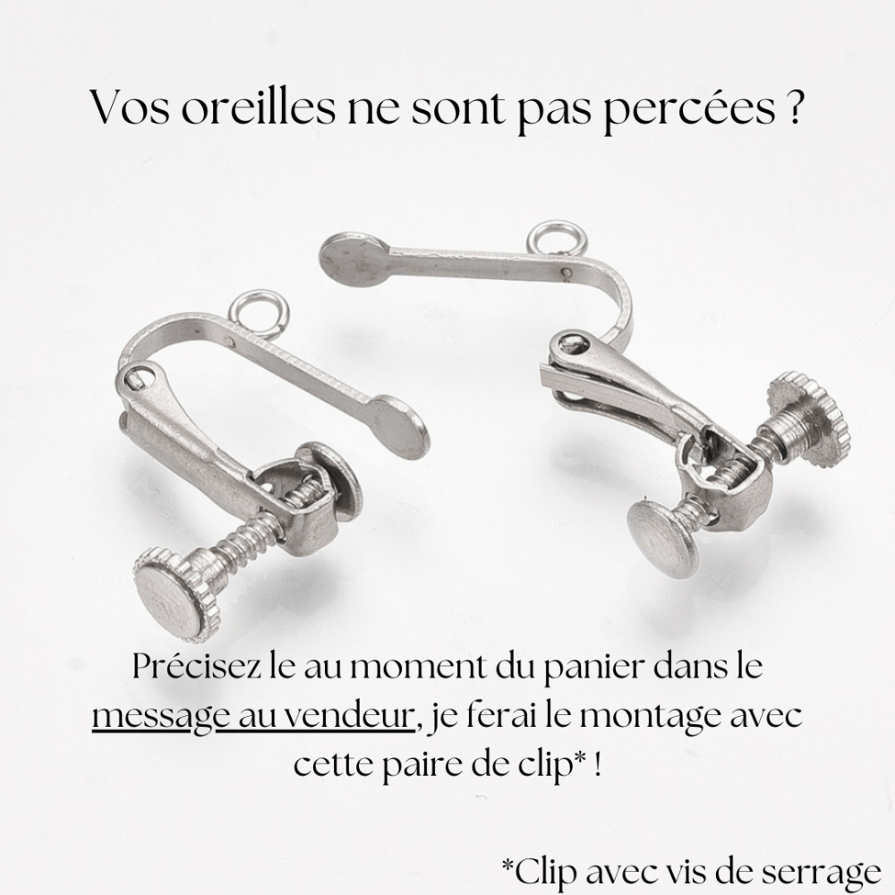 Si vos oreilles ne sont pas percées, précisez le au moment du panier ! Montage avec clip disponible
