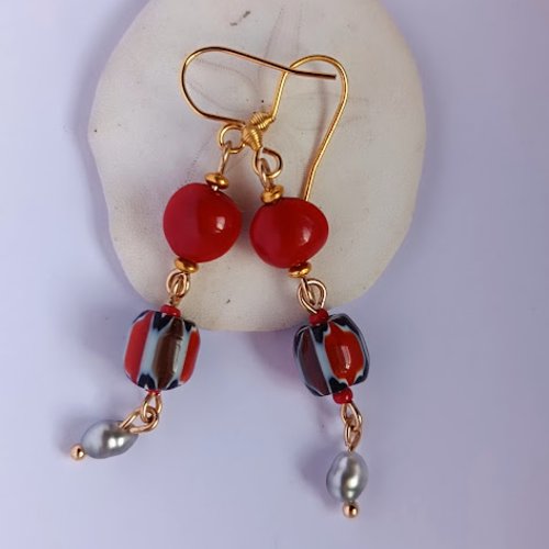 Jolies boucles d'oreilles sublimées par un petit keshi gris nacré, perles de chevron rouges et noires et graines l'église rouges naturelles