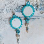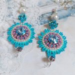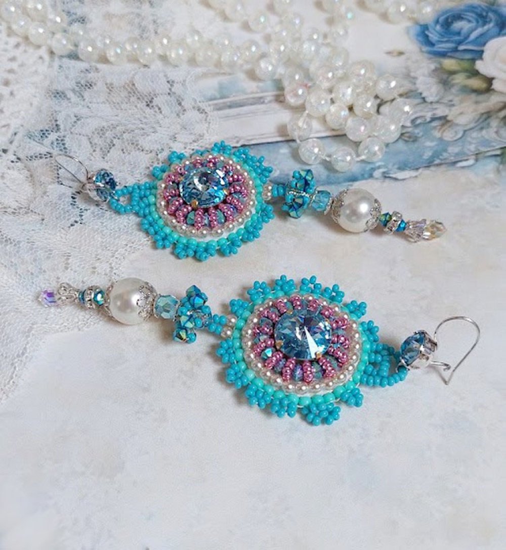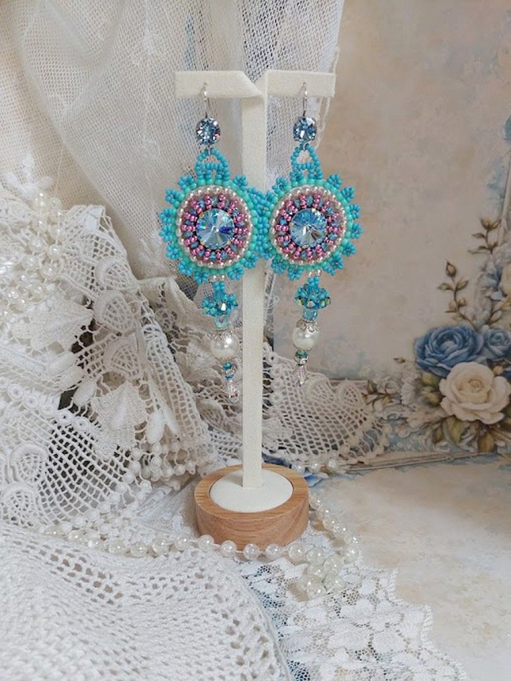 Boucles Beauty Alicia Blue brodées avec cristaux en Cristal Swarovski : cabochons, perles nacrées, rondes st toupies à laquelle s’ajoute des nacrées en verre plus petites, rondelles strass, coupelles filigranées et crochets Argent 925