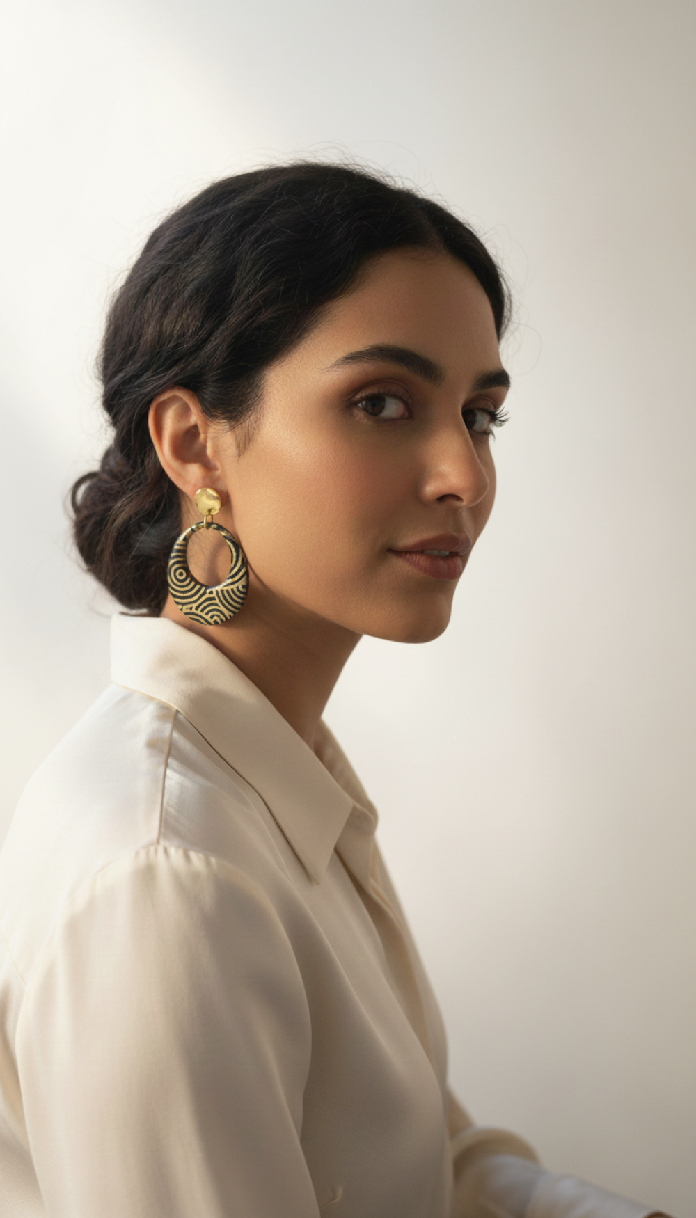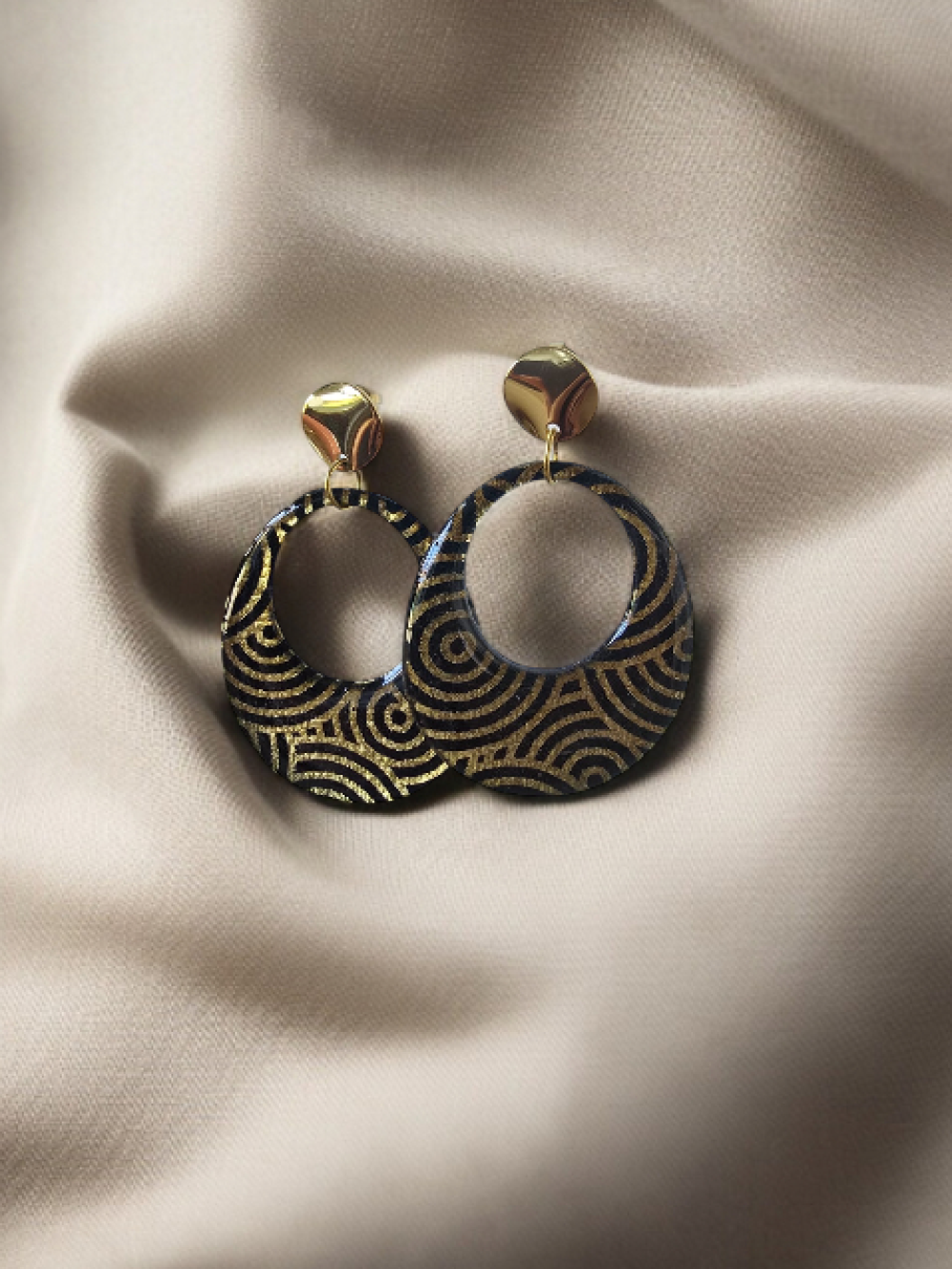 Ces boucles uniques allient légèreté et élégance grâce à leur design artisanal. Réalisées en papier Indien noir et doré, elles sont soigneusement résinées et vernies afin d’assurer une belle brillance et une protection durable.