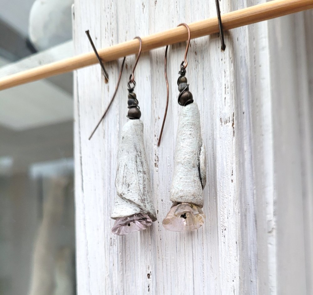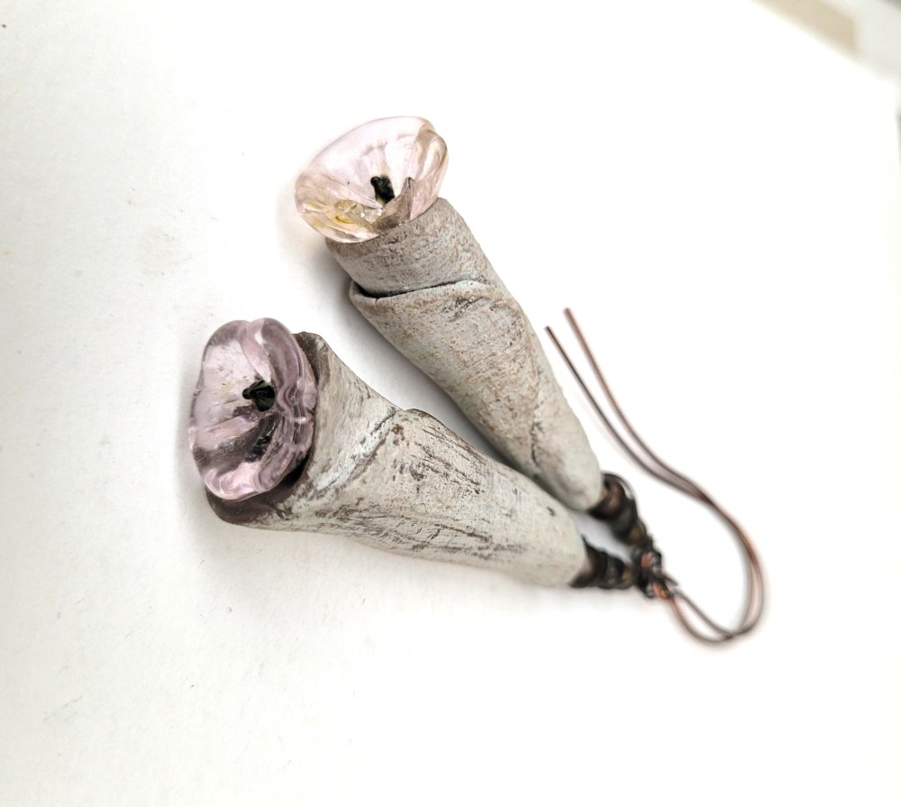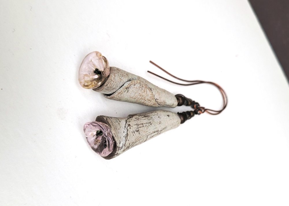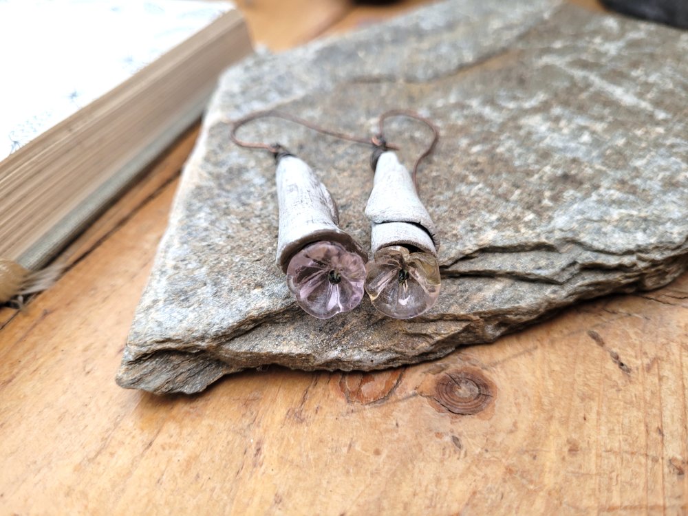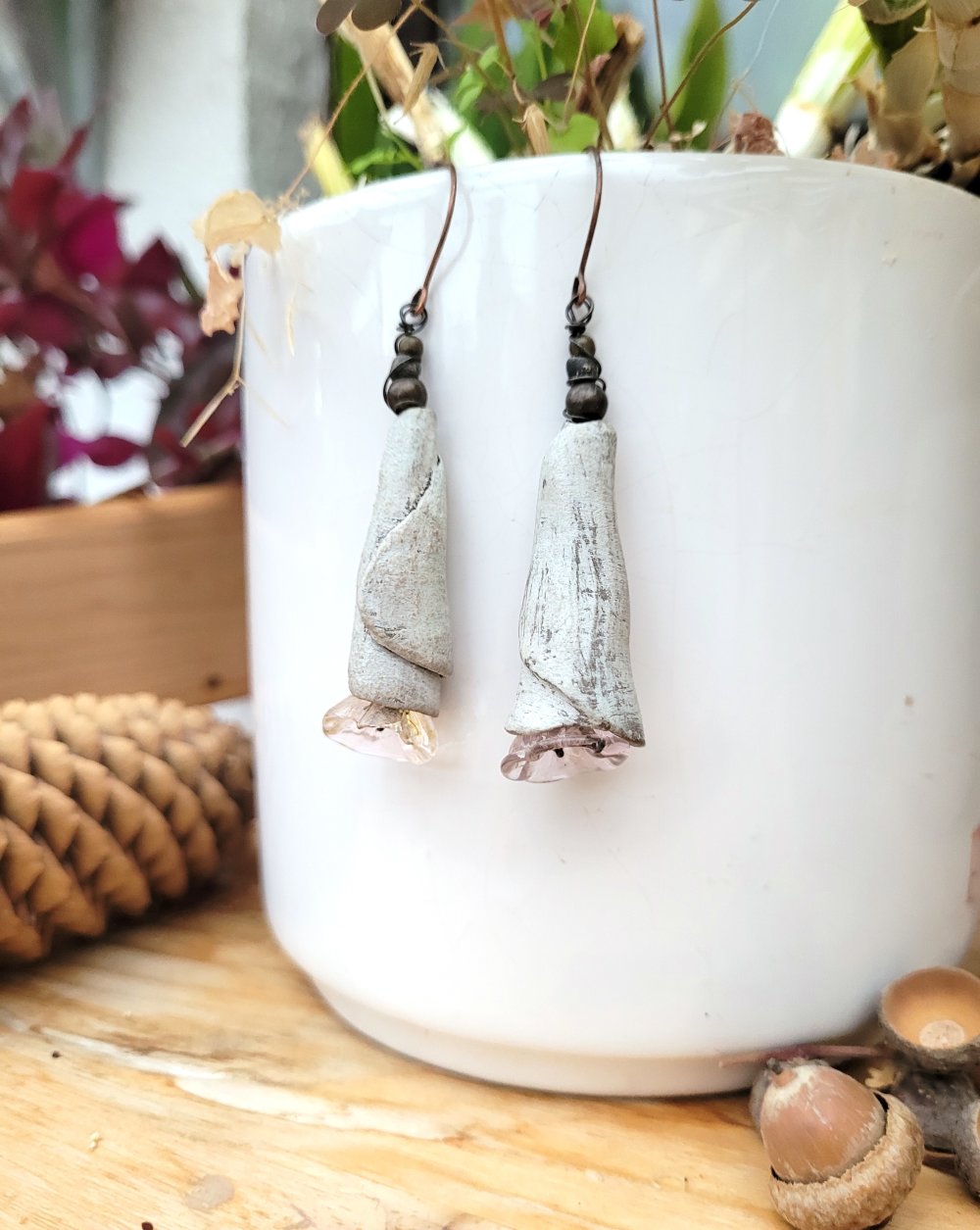 Ces boucles d’oreilles uniques sont composées de magnifiques breloques en céramique raku artisanale, délicatement façonnées en forme de fleur. Leur cœur est mis en valeur par de sublimes perles lampwork artisanales en verre rose, accompagnées de perles en bronze et en verre pour une touche d’élégance subtile.