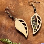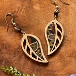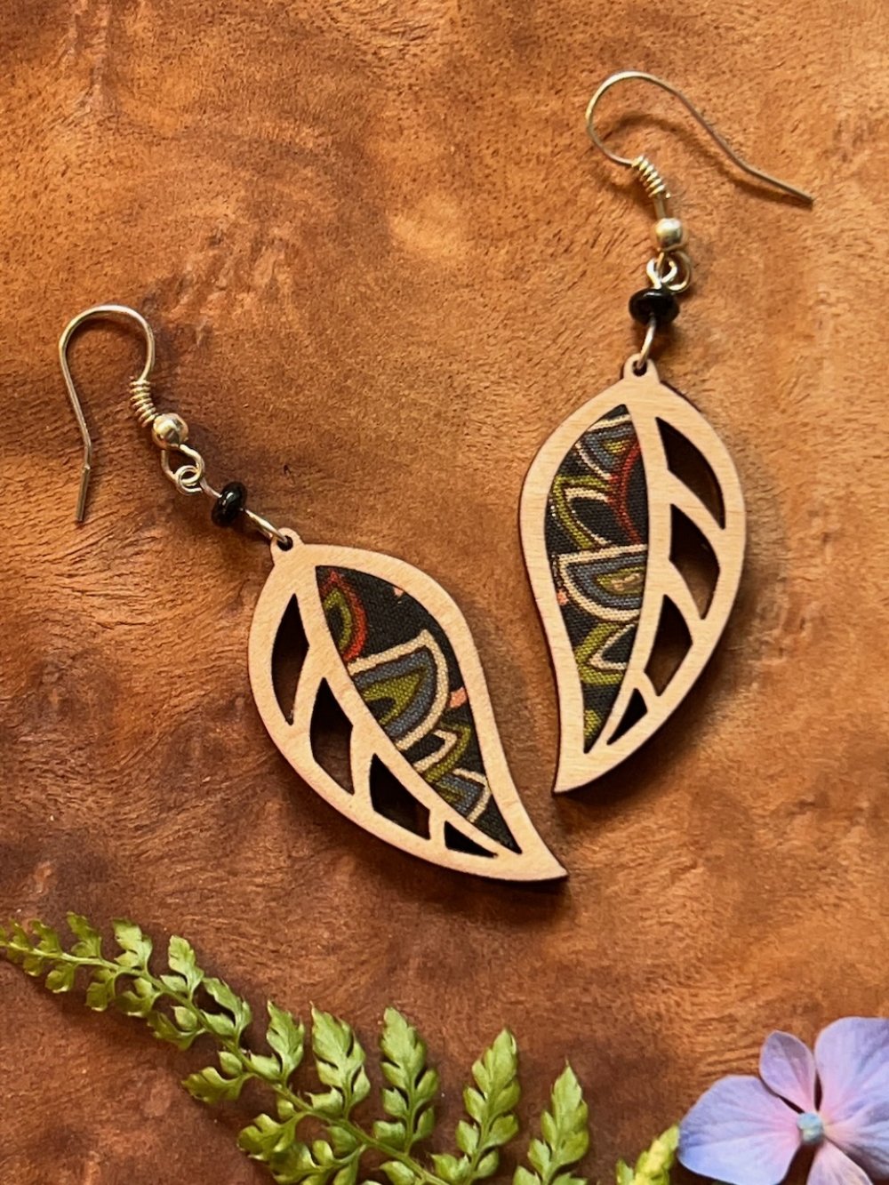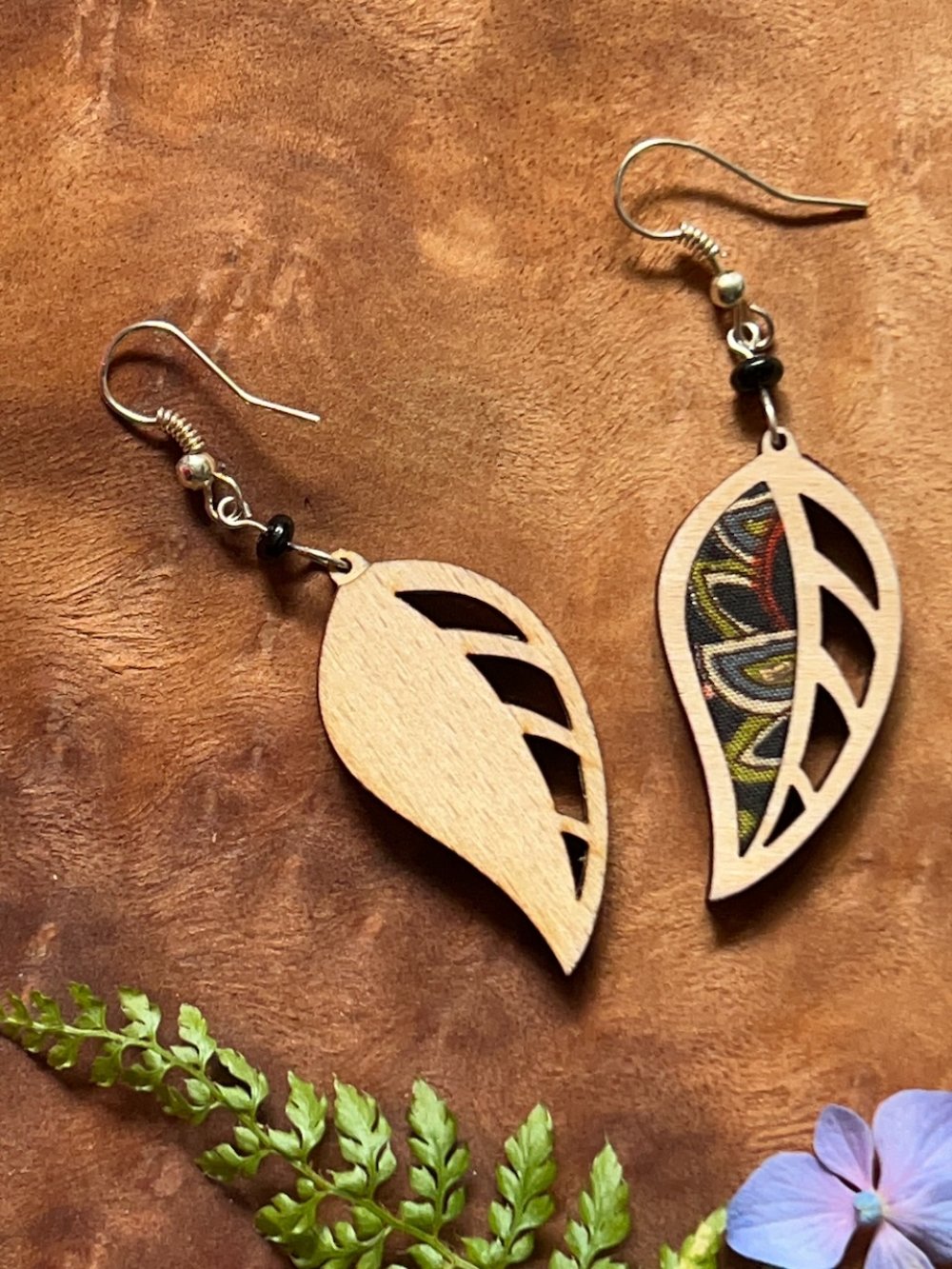 Modèle unique de boucles d'oreilles en bois de hêtre avec incrustation de tissu, crochets hypoallergéniques