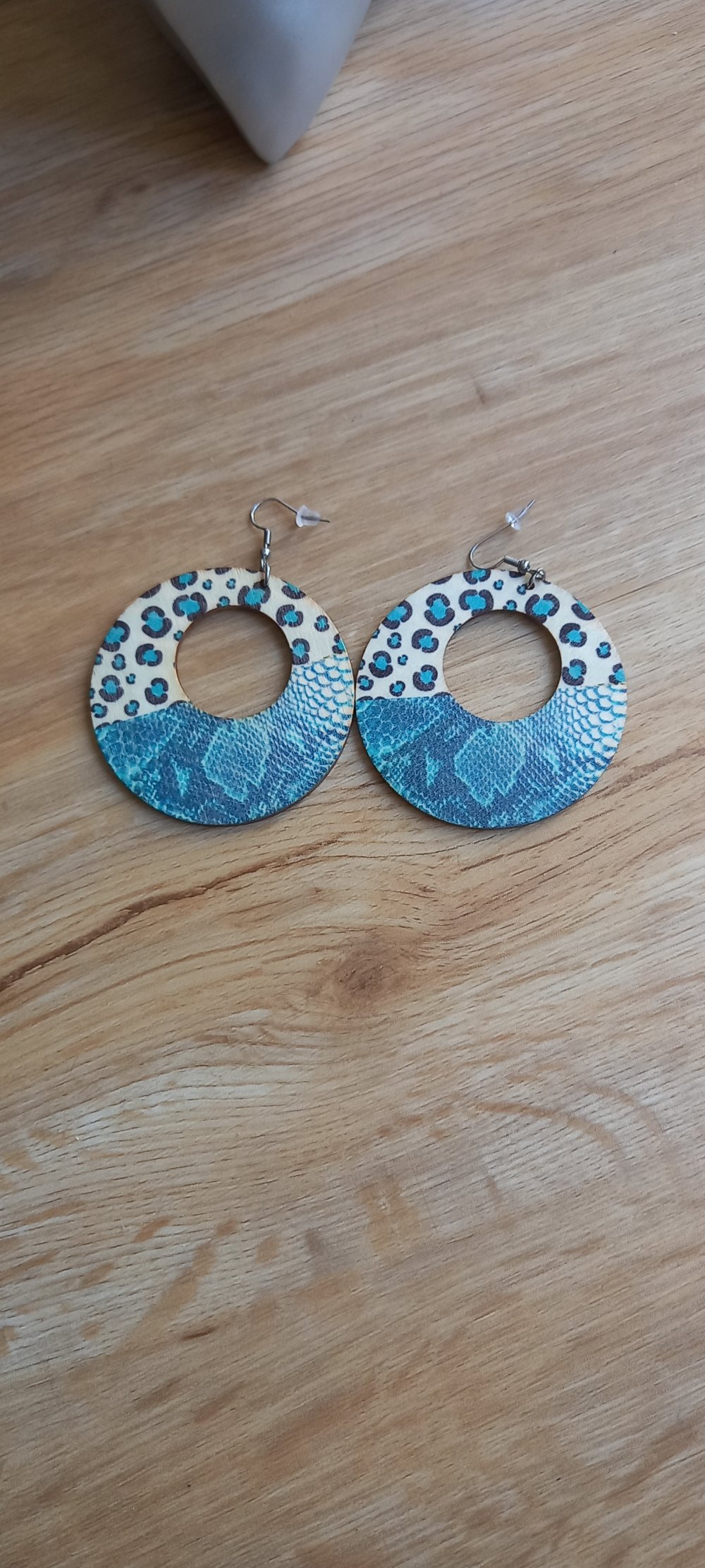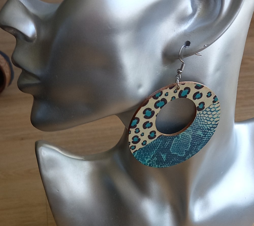 Grandes boucles d'oreilles bois imprimé léopard, bleu