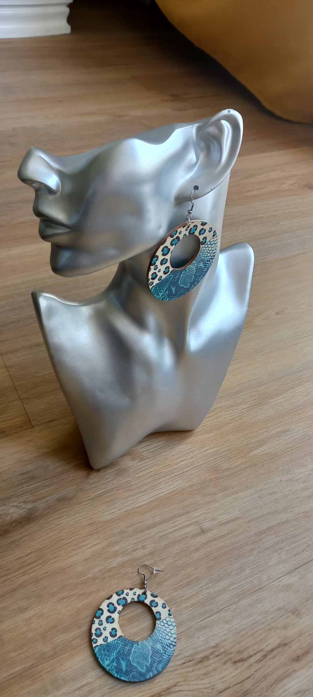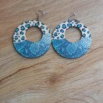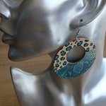 Grande boucles d'oreilles en bois de coco, très très légères et crochets d'oreille en acier inoxydable. Même imprimé recto verso. Colori imprimé léopard, bleu. Elles existent dans d'autres coloris (Voir modèles sur photo).
