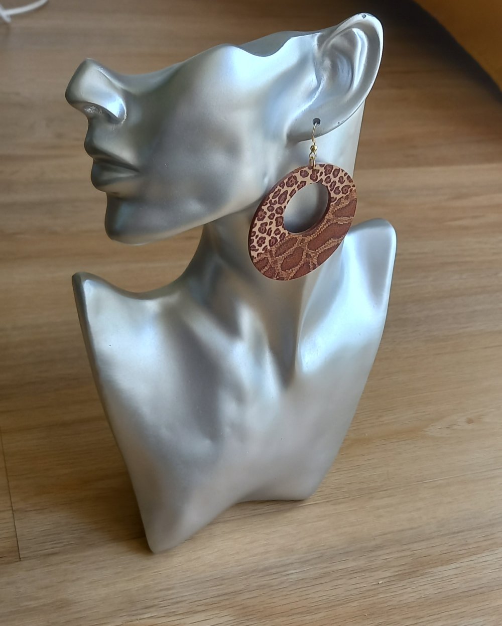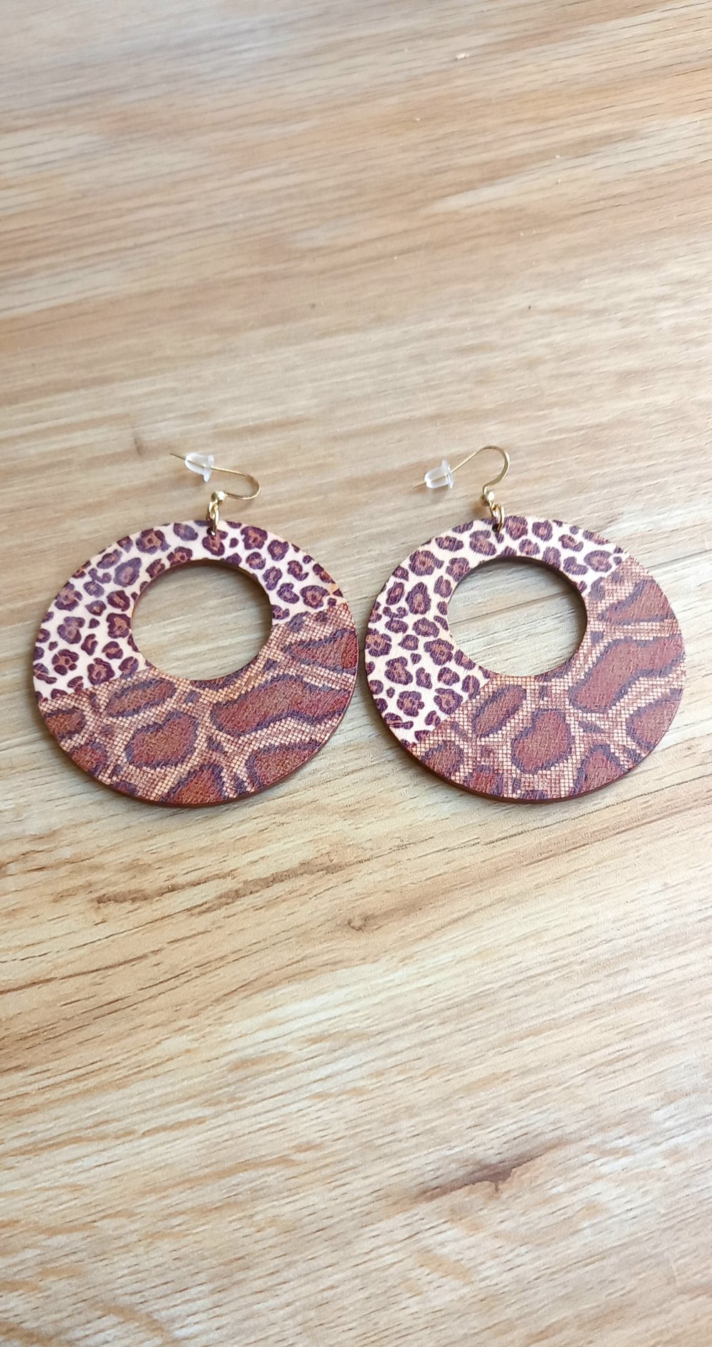 Grande boucles d'oreilles en bois de coco, très très légères et crochets d'oreille en acier inoxydable. Même imprimé recto verso. Colori imprimé léopard, marron. Elles existent dans d'autres coloris (Voir modèles sur photo).