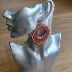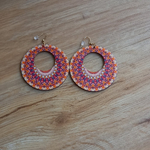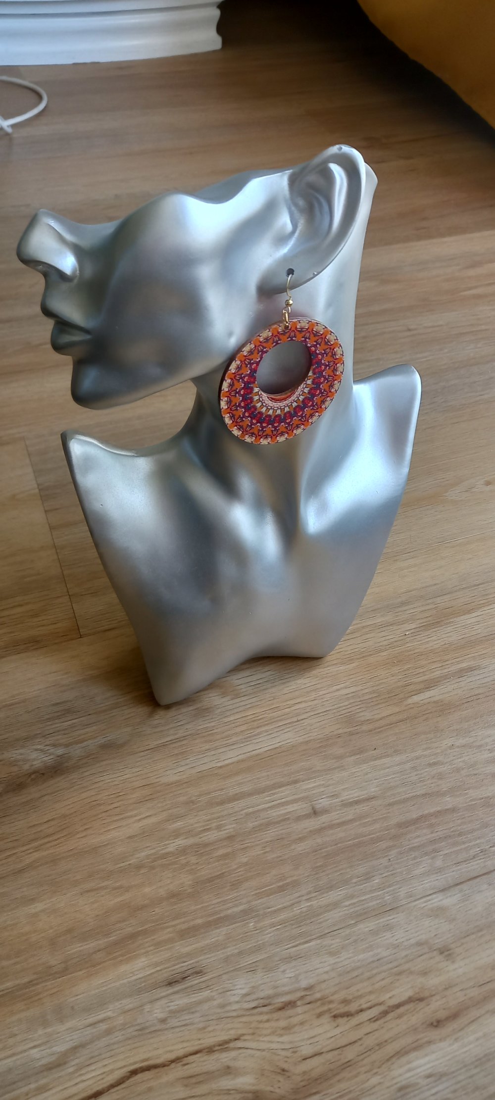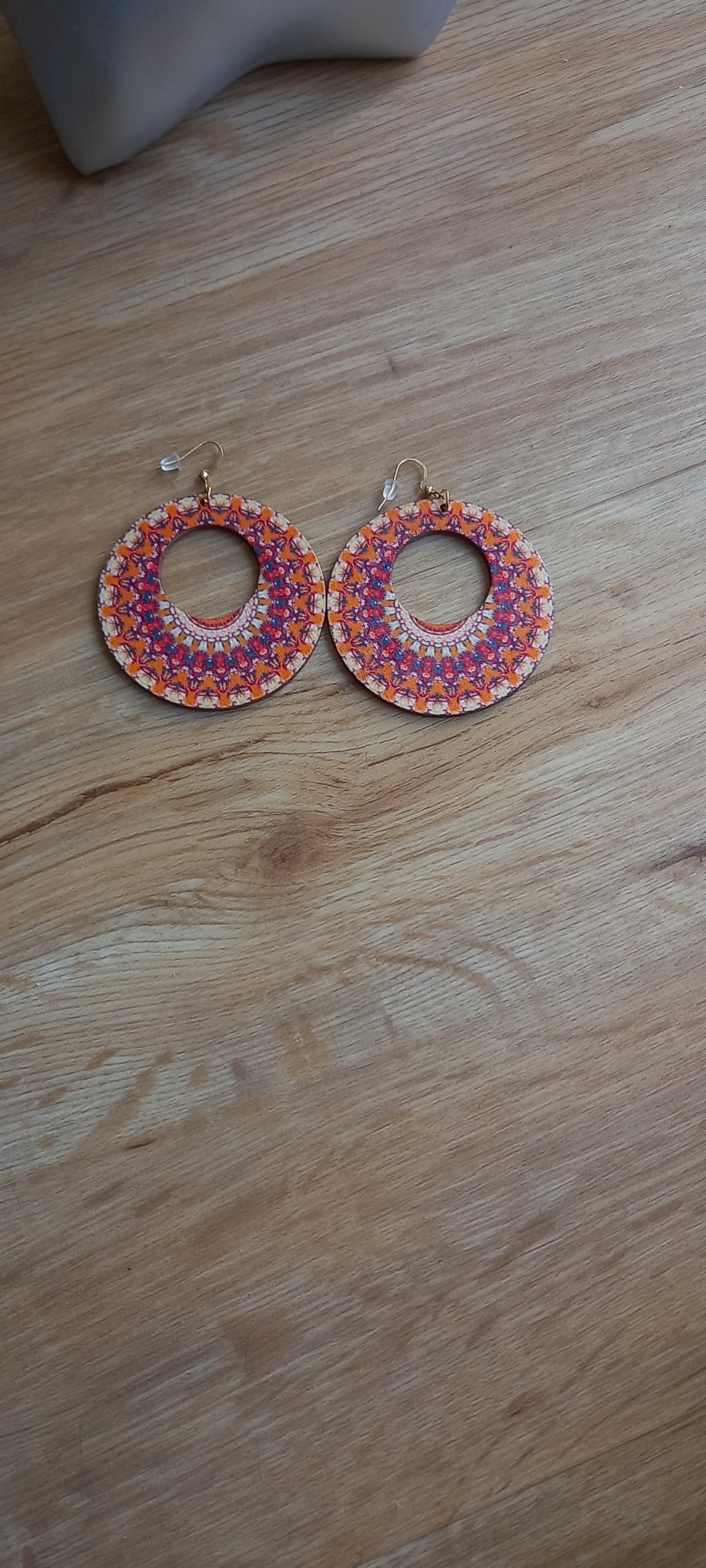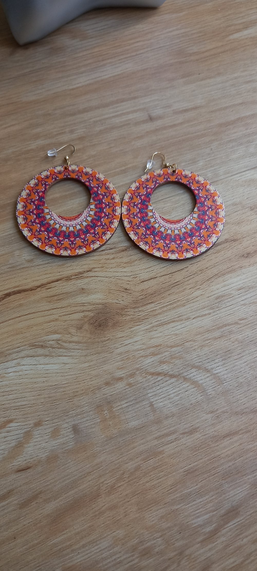 Grande boucles d'oreilles en bois de coco, très très légères et crochets d'oreille en acier inoxydable. Même imprimé recto verso. Mélange de couleurs (rouge orangé, beige, bleu). Elles existent dans d'autres coloris (Voir modèles sur photo).