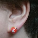Boucles d'Oreilles " Boule de Noël " version clou appelée également puce d'oreille, en pâte polymère, décorées de flocons blancs et paillettes, montées sur une petite coupelle à bord en métal doré.
