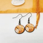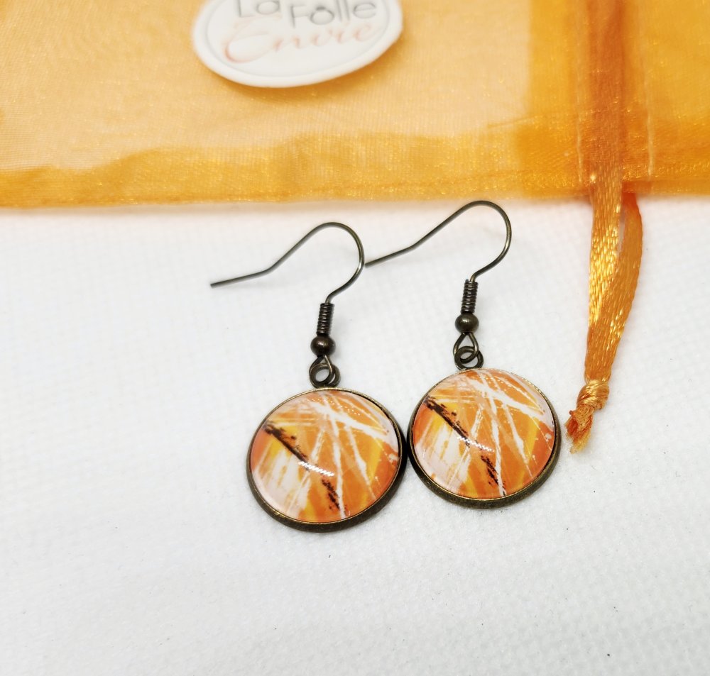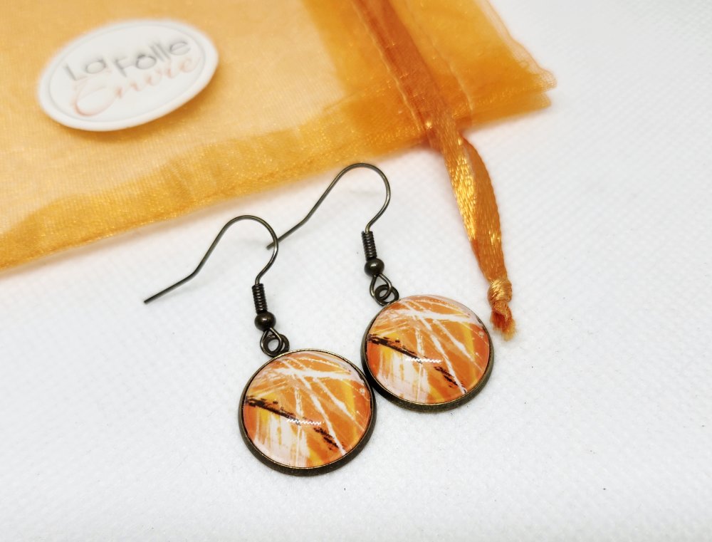 Boucles d'oreilles bronze pendantes cabochon verre motif abstrait orangé