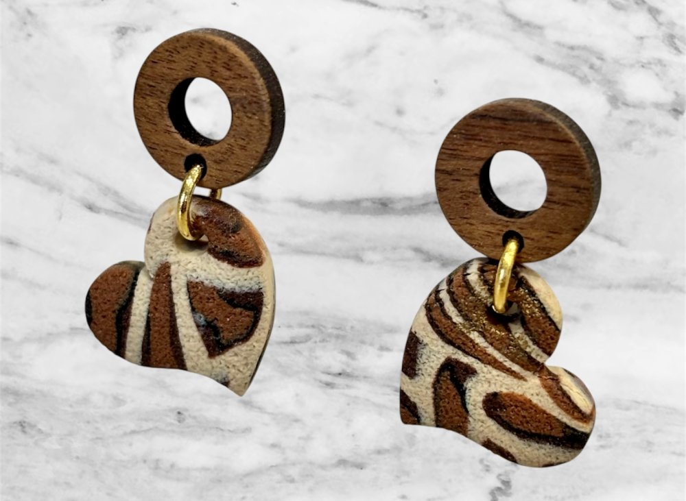 Boucles d’oreilles en pâte polymère et acier inoxydable avec l’accroche en bois et son petit cœur léopard
