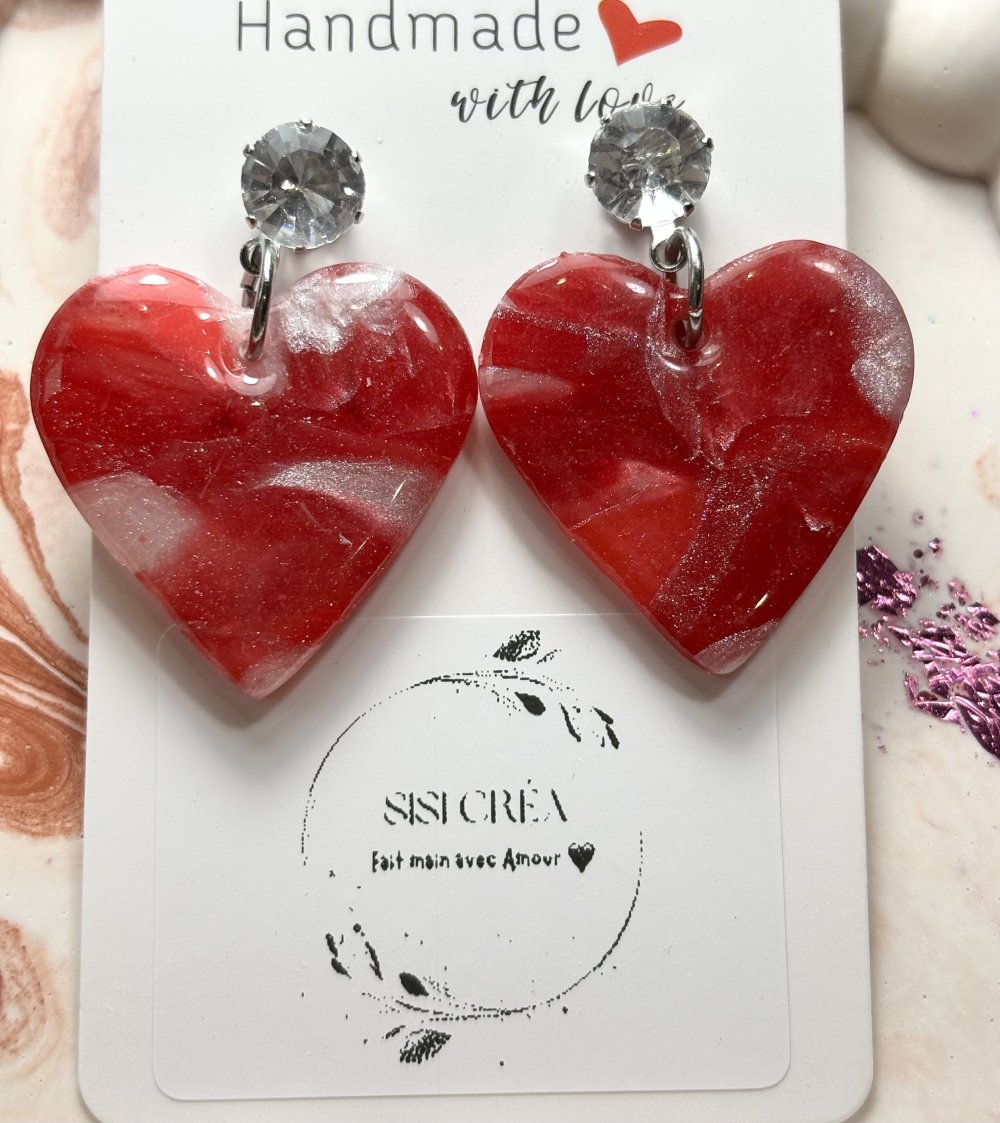 Boucles d’oreilles en pâte polymère recouvert de résine UV et acier inoxydable en forme de cœur avec son petit strass