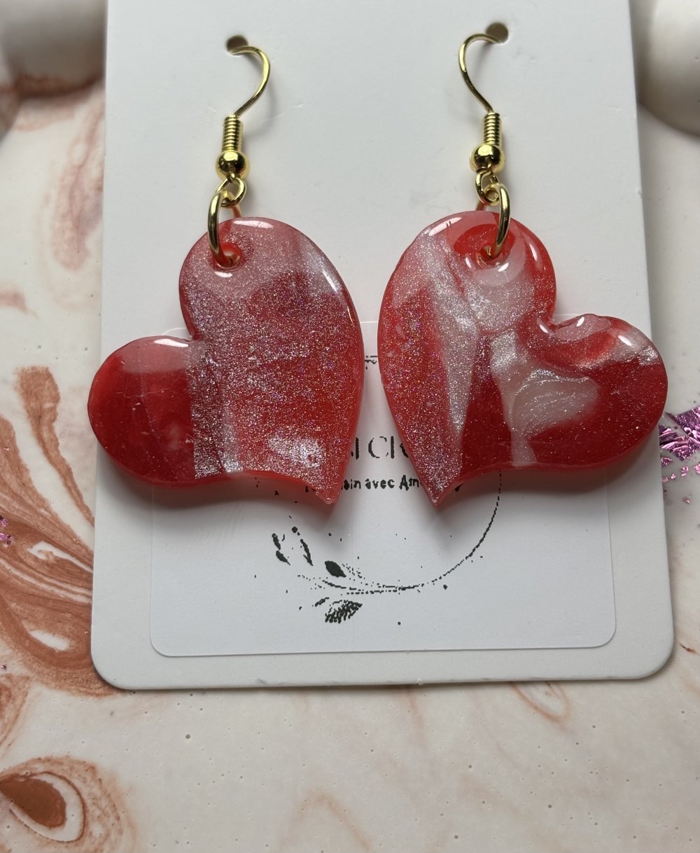 Boucles d’oreilles en pâte polymère recouvert de résine UV et acier inoxydable en forme de cœur de couleur blanc nacré qui apporte la touche de paillettes et un mélange de rouge bordeaux