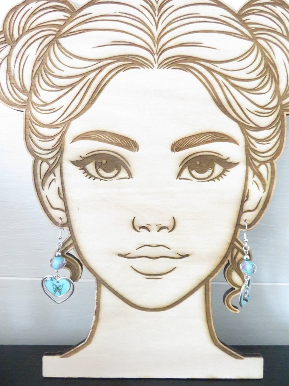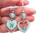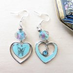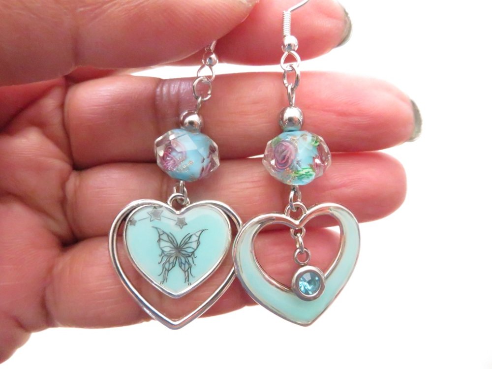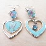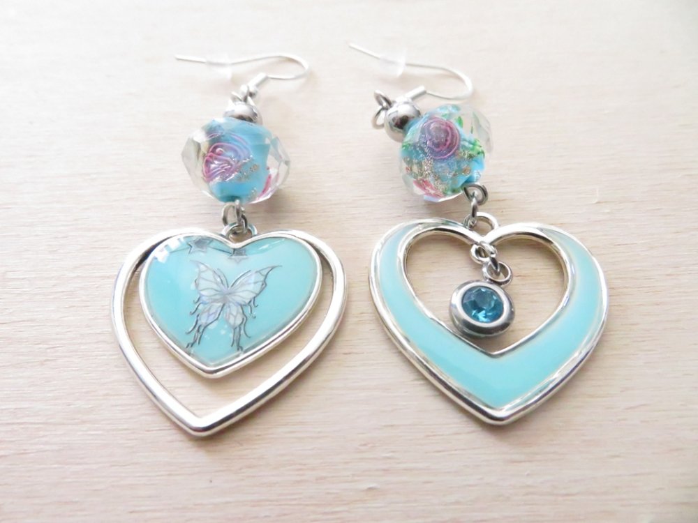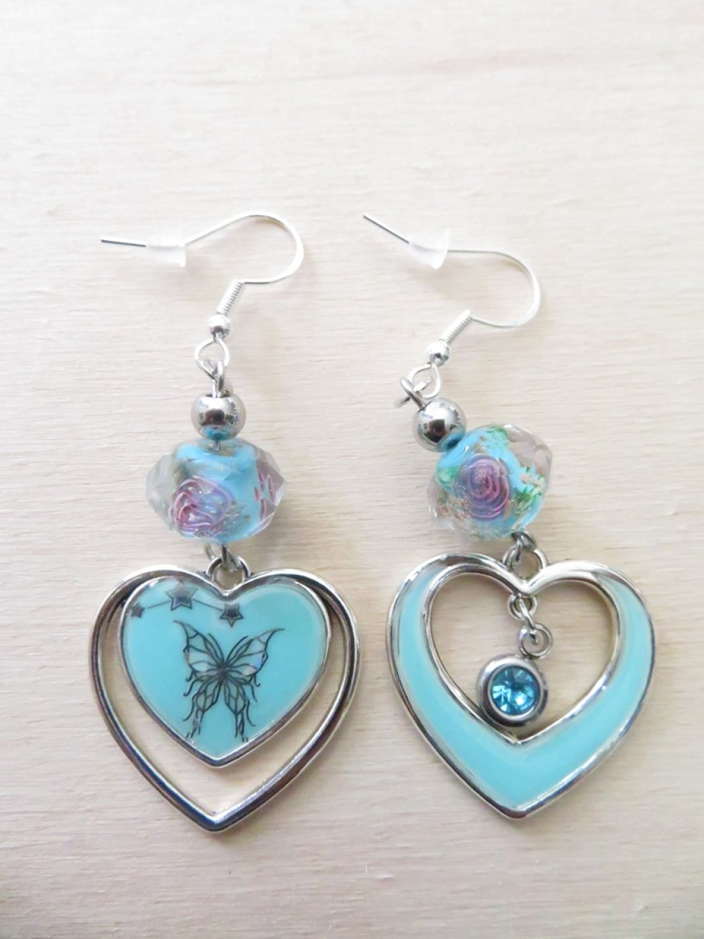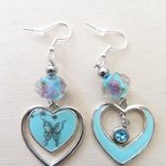 Boucles d'oreilles fantaisie argent 925 et des cœurs bleu turquoise avec papillon