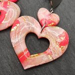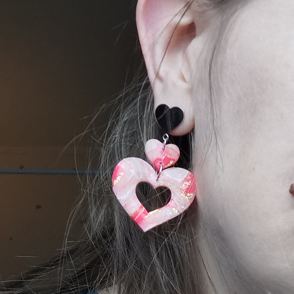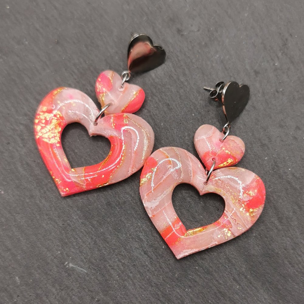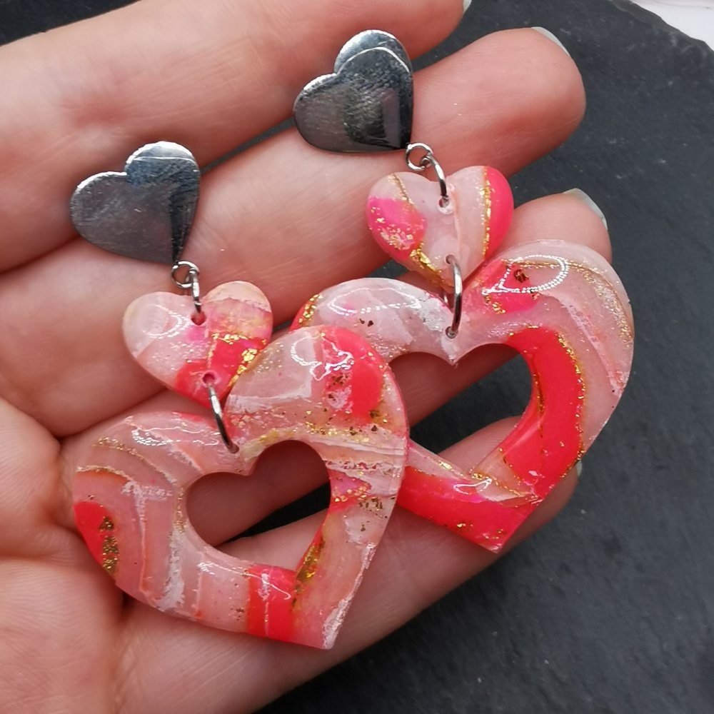 - Boucles d'oreilles en pâte polymère translucide marbré du translucide blanc au rose presque fluo, sublimer par une couche de résine.