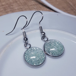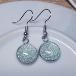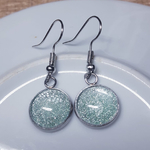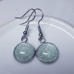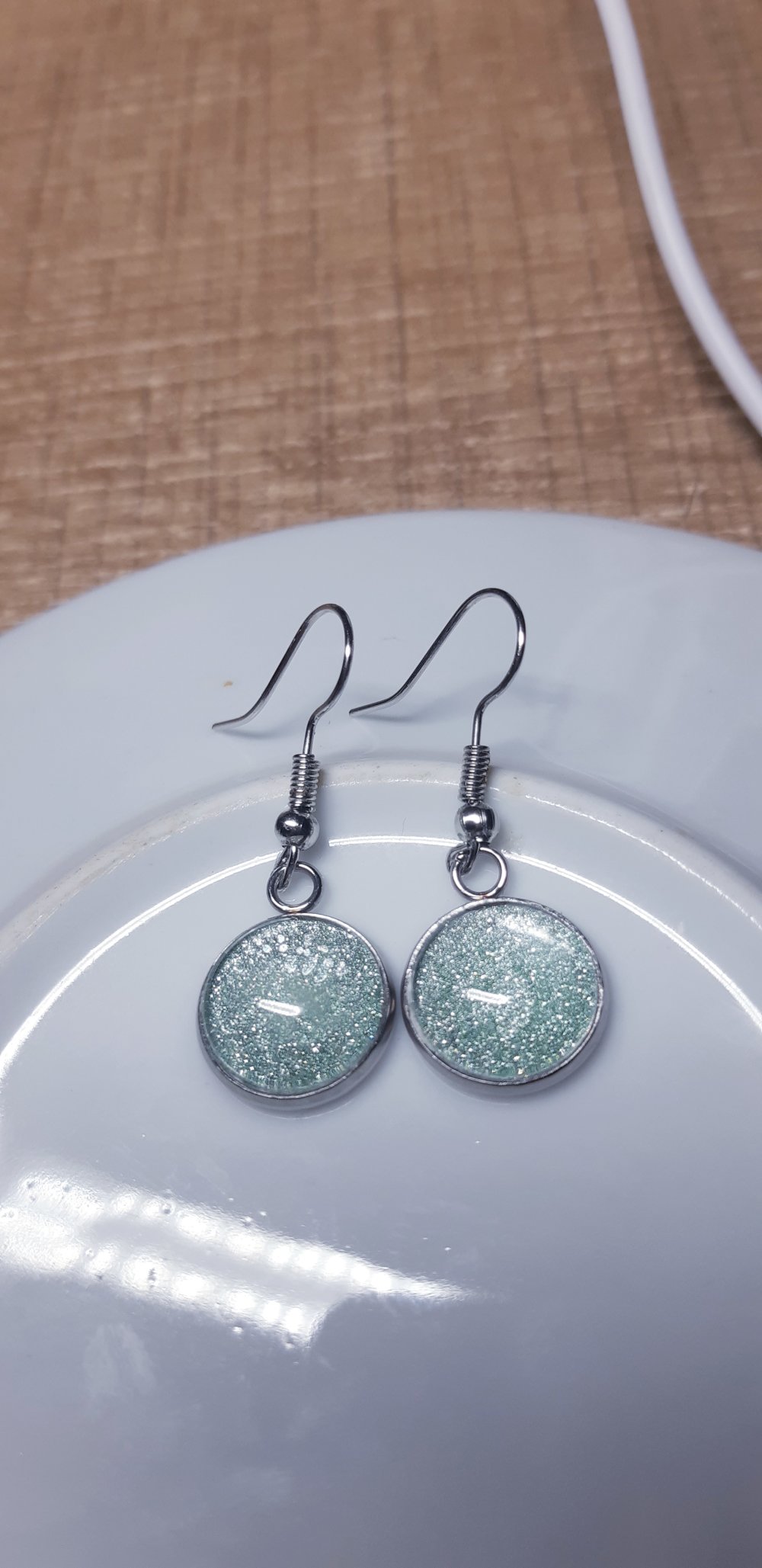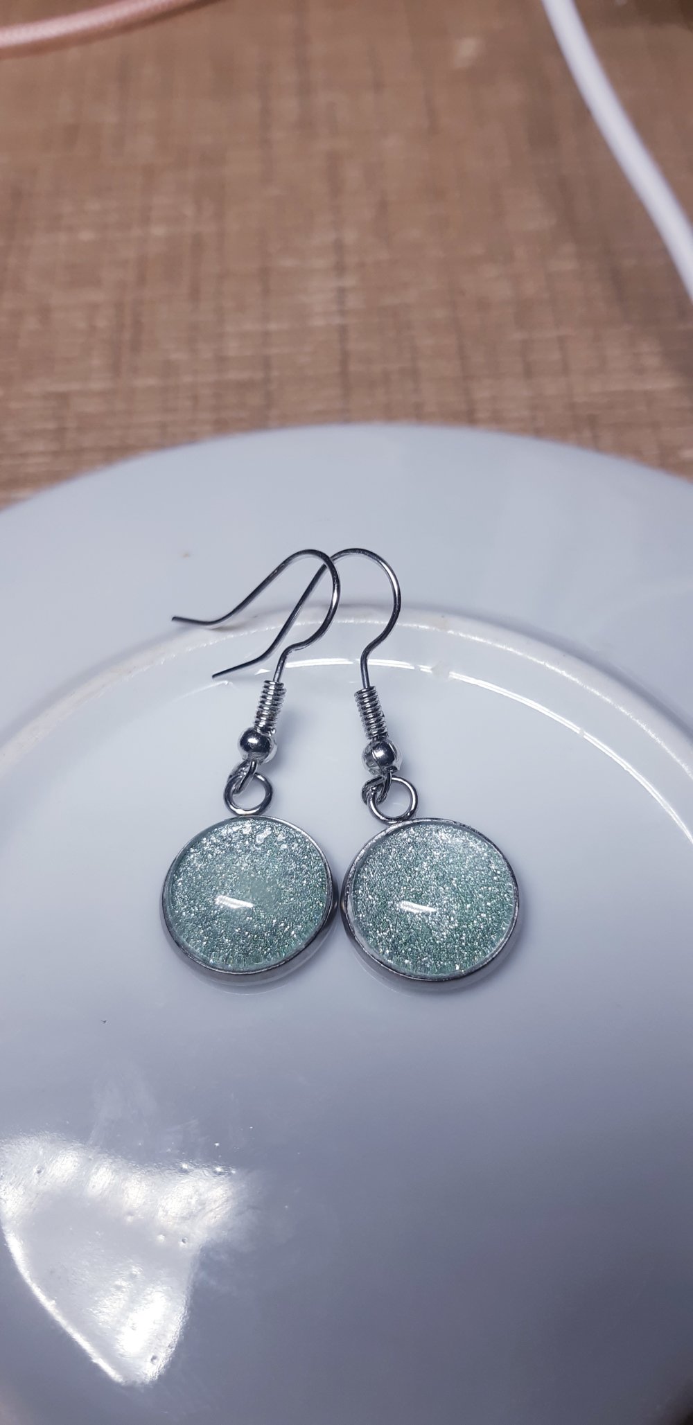 Boucles d'oreilles cabochon de verre à paillettes vert d'eau et argent - acier inoxydable - Idée cadeau femme - Cadeaux de Noël