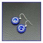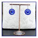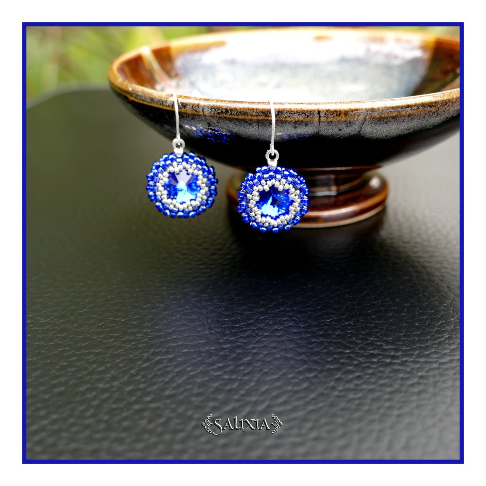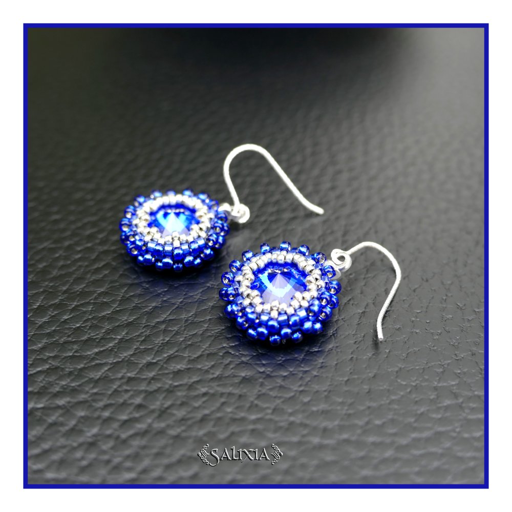 Ces boucles d'oreilles se composent de cabochons ronds en cristal de Swarovski® bleu intense entourés d'un tissage de rocailles japonaises Miyuki* bleu cobalt et argentées dos tissé en étoile (voir photo d'un autre modèle), leur longueur est de 3.5 cm dont 1.5 cm pour les crochets torsadé en argent 925 traité anti ternissement, leur poids est de 4 gr. (pour les 2)