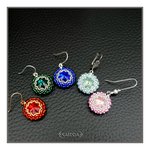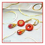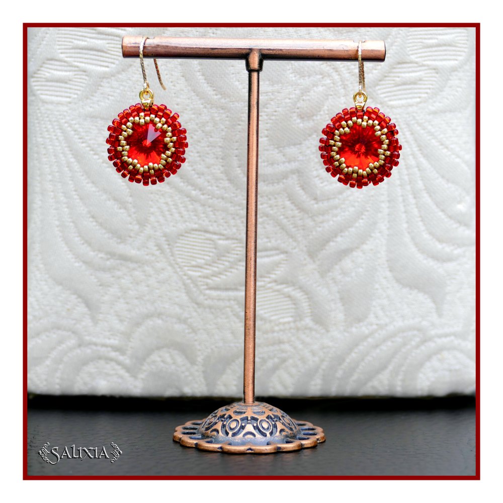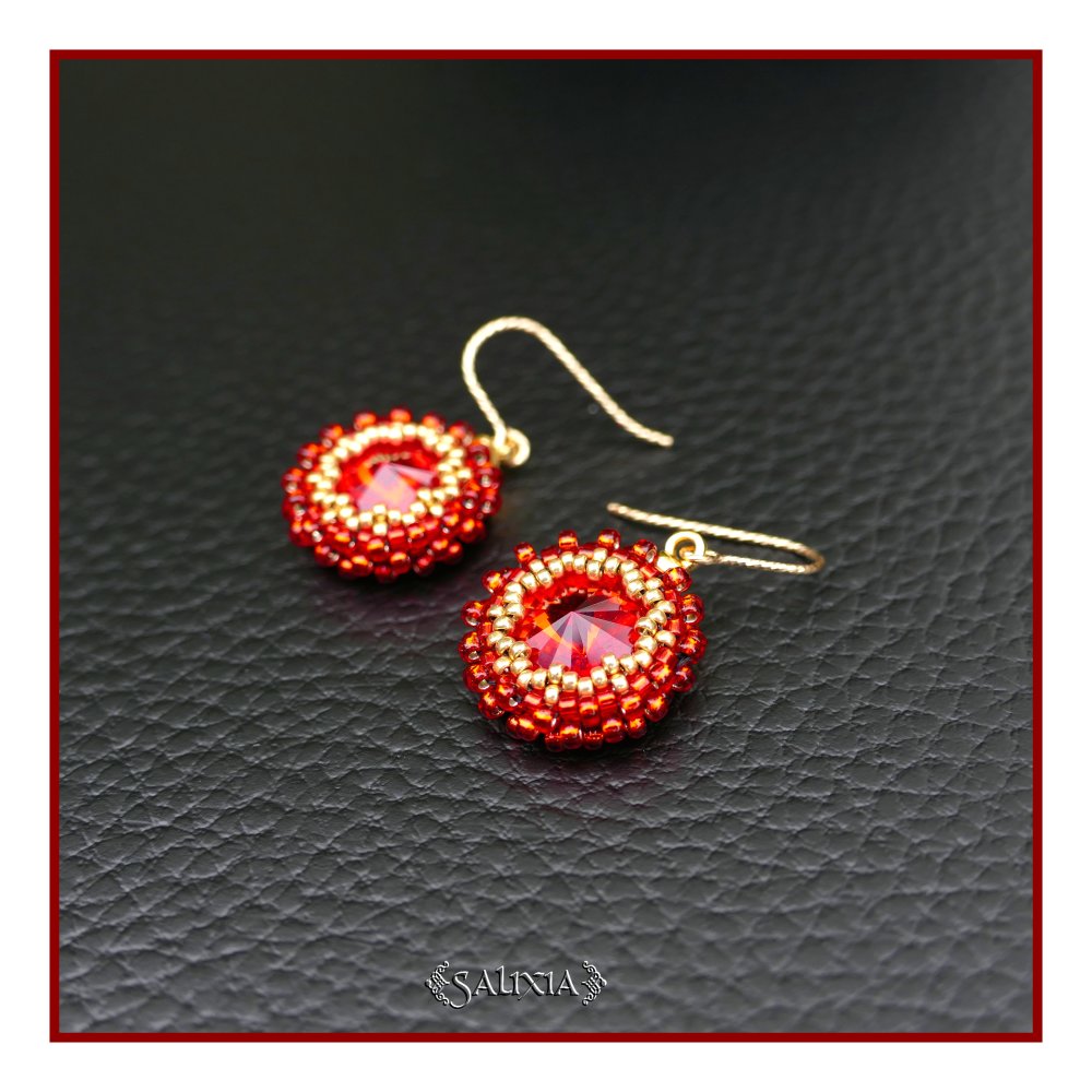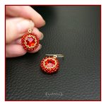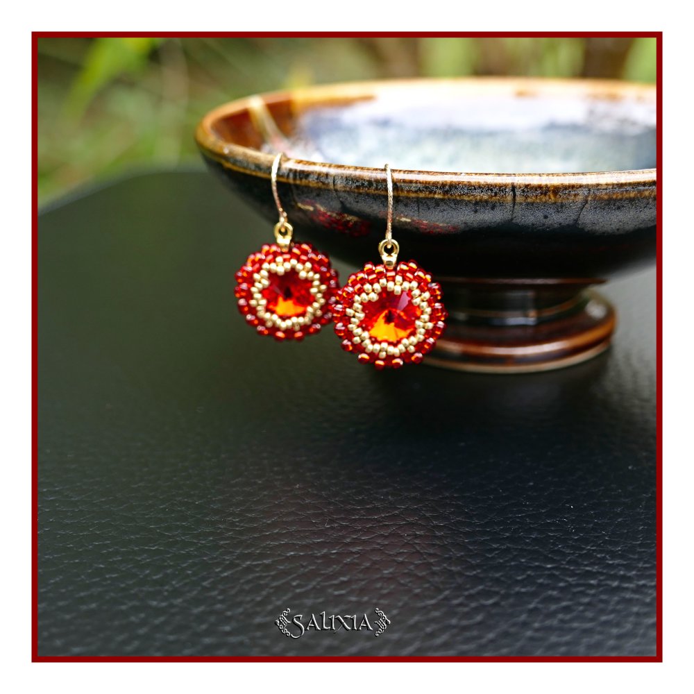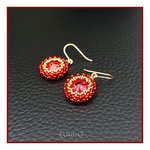Ces boucles d'oreilles se composent de cabochons ronds en cristal de Swarovski® rouge intense entourés d'un tissage de rocailles japonaises Miyuki* rouge irisé et dorées, dos tissé en étoile (voir photo d'un autre modéle), leur longueur est de 3.5 cm dont 1.5 cm pour les crochets en gold filled* 14 carats traité anti ternissement, leur poids est de 4 gr. (pour les 2)