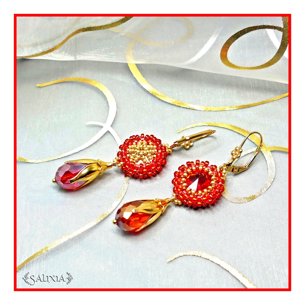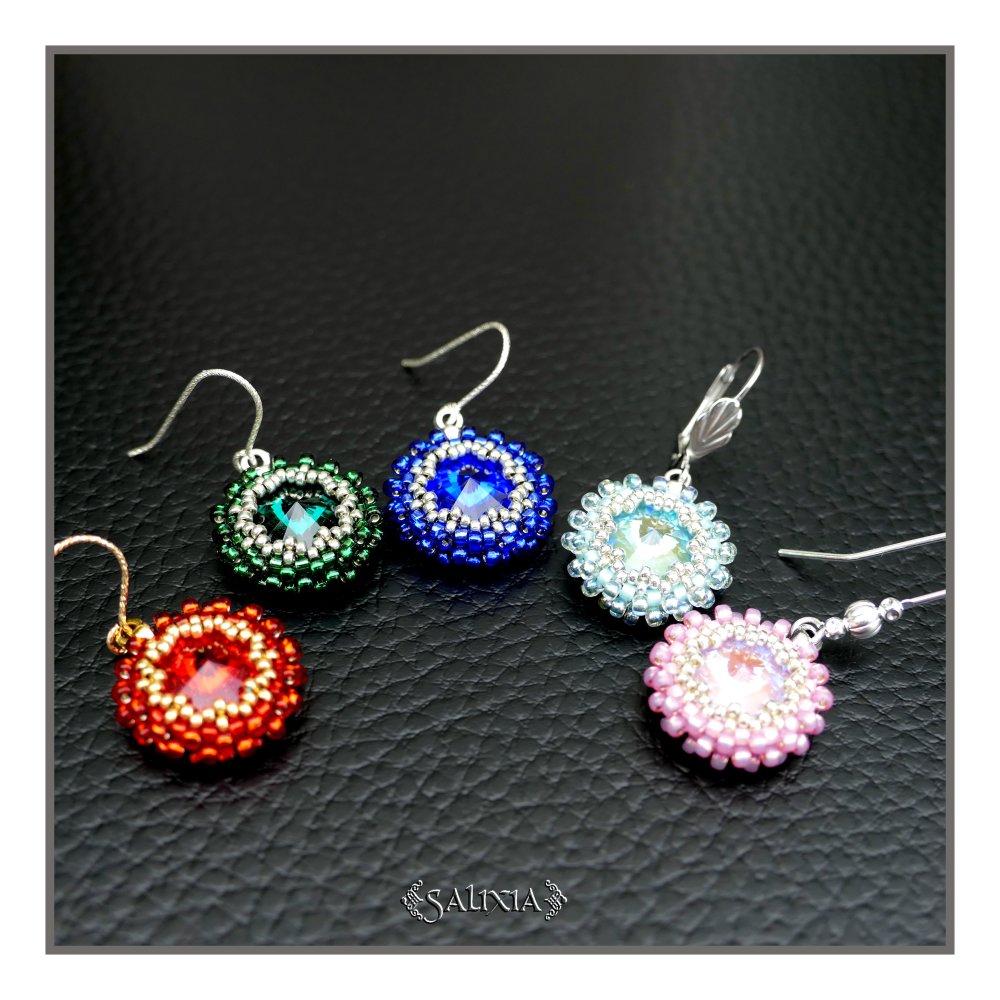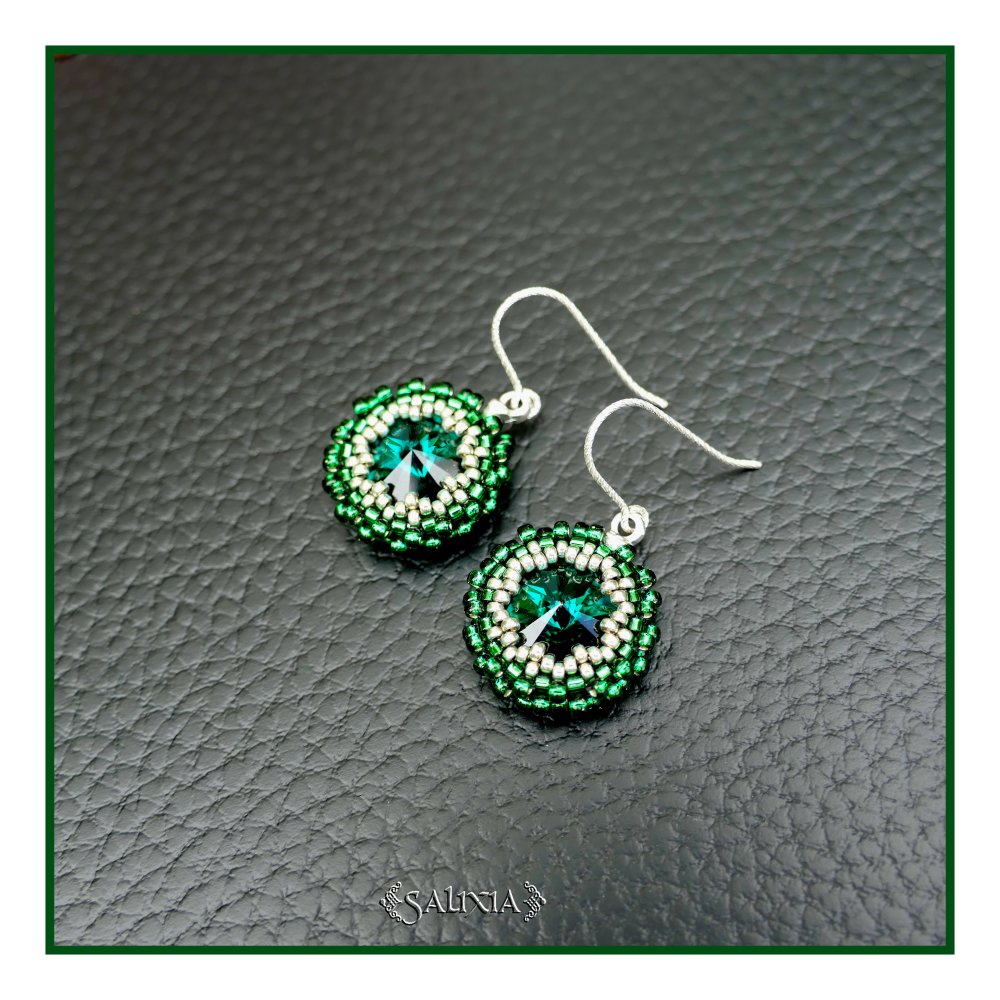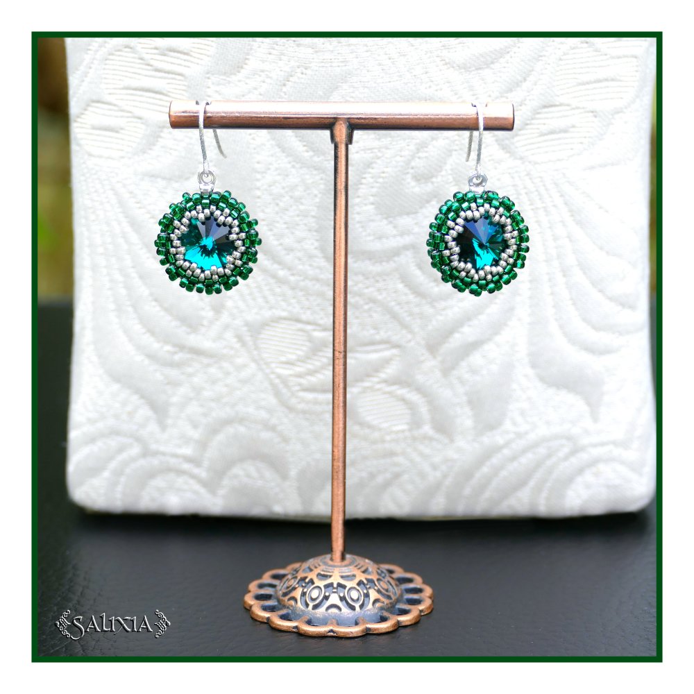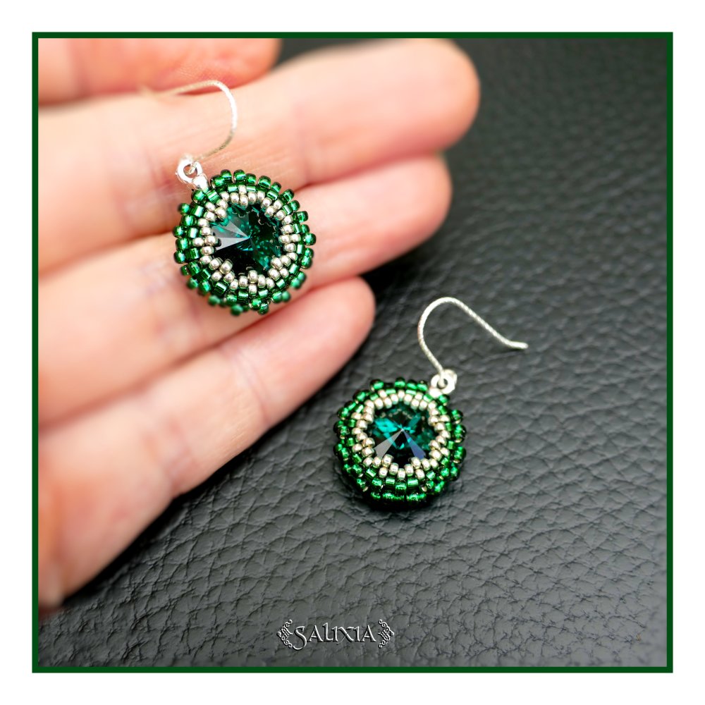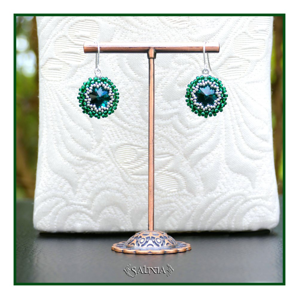 Ces boucles d'oreilles se composent de cabochons ronds en cristal de Swarovski® vert émeraude entourés d'un tissage de rocailles japonaises Miyuki* vert lumineux et argentées dos tissé en étoile (voir photo d'un autre modèle), leur longueur est de 3.5 cm dont 1.5 cm pour les crochets torsadé en argent 925 traité anti ternissement, leur poids est de 4 gr. (pour les 2)