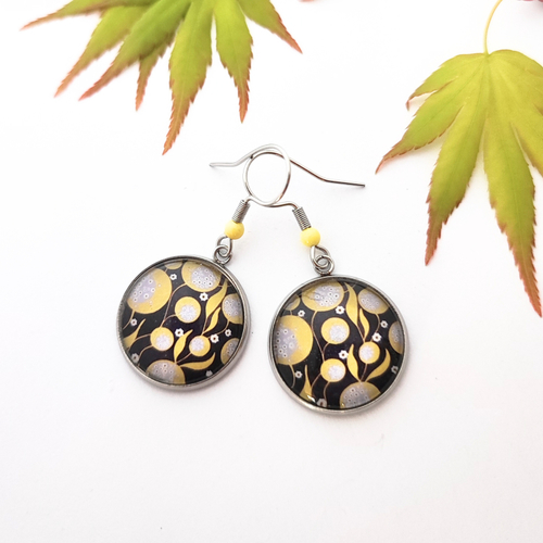 Boucles d'oreilles cabochons motifs jaune, gris et noir, idée cadeau